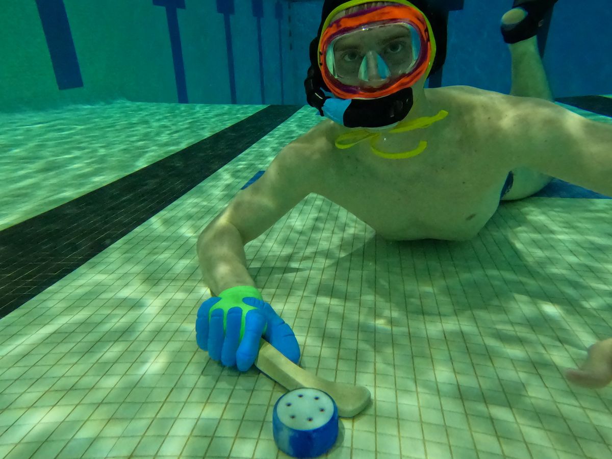 It is the ultimate sport and is played at the bottom of a swimming pool, with a typical depth of two meters deep. The game is played six-on-six with players using a short one-handed stick to maneuver a weighted puck along the bottom of the pool. The game is played holding your breath wearing a water polo cap with a snorkel and a mask. The goal of the game is to work as a team and get the puck in the other team’s goal on the other side of the pool. The competition is played in two 15-minute halves and teams score goals similar to traditional hockey.