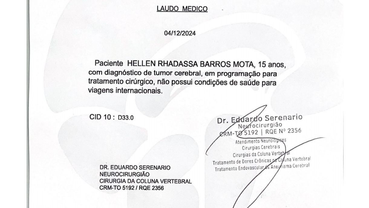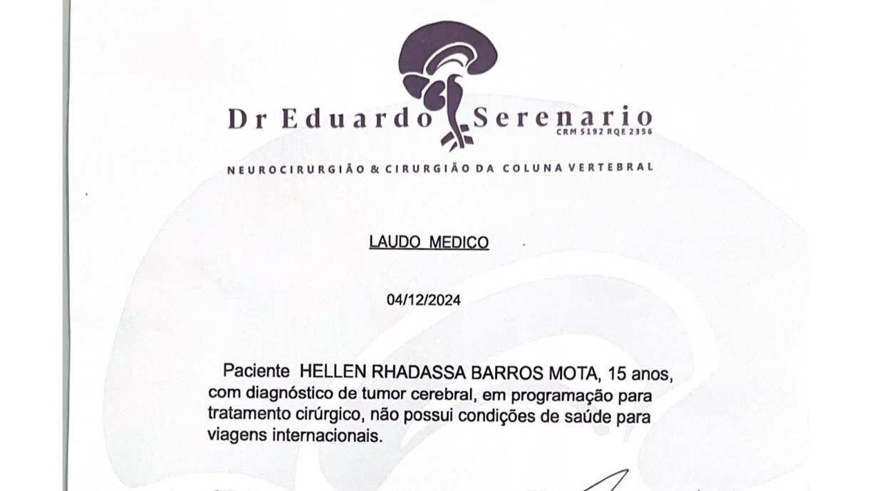 Hello friends, I come through this campaign to ask for your help with my sister's medical costs in removing the tumor that we have just discovered. Hellen Radassa is my younger sister, 15 years old, lives in Brazil with my mother. She had a flight scheduled for November 30th to come live with me in Ireland and study high school. But on the 29th in the afternoon, my mother received the results of tests that she had done in the last week due to an ear infection, dizziness and darkened vision, showing the tumor between the auditory region and the cerebellum. The waiting list in the public system for neurological surgery in our city is 4-5 months. The health plan will not cover the surgery because it is high risk and requires two neurologists. the total cost in the quote we received was R$9,450.00, equivalent to €1490.00. It seems like little, but unfortunately I won't be able to get that amount until Tuesday, the date of the surgery, and I would be grateful with all my heart for any amount you can donate.