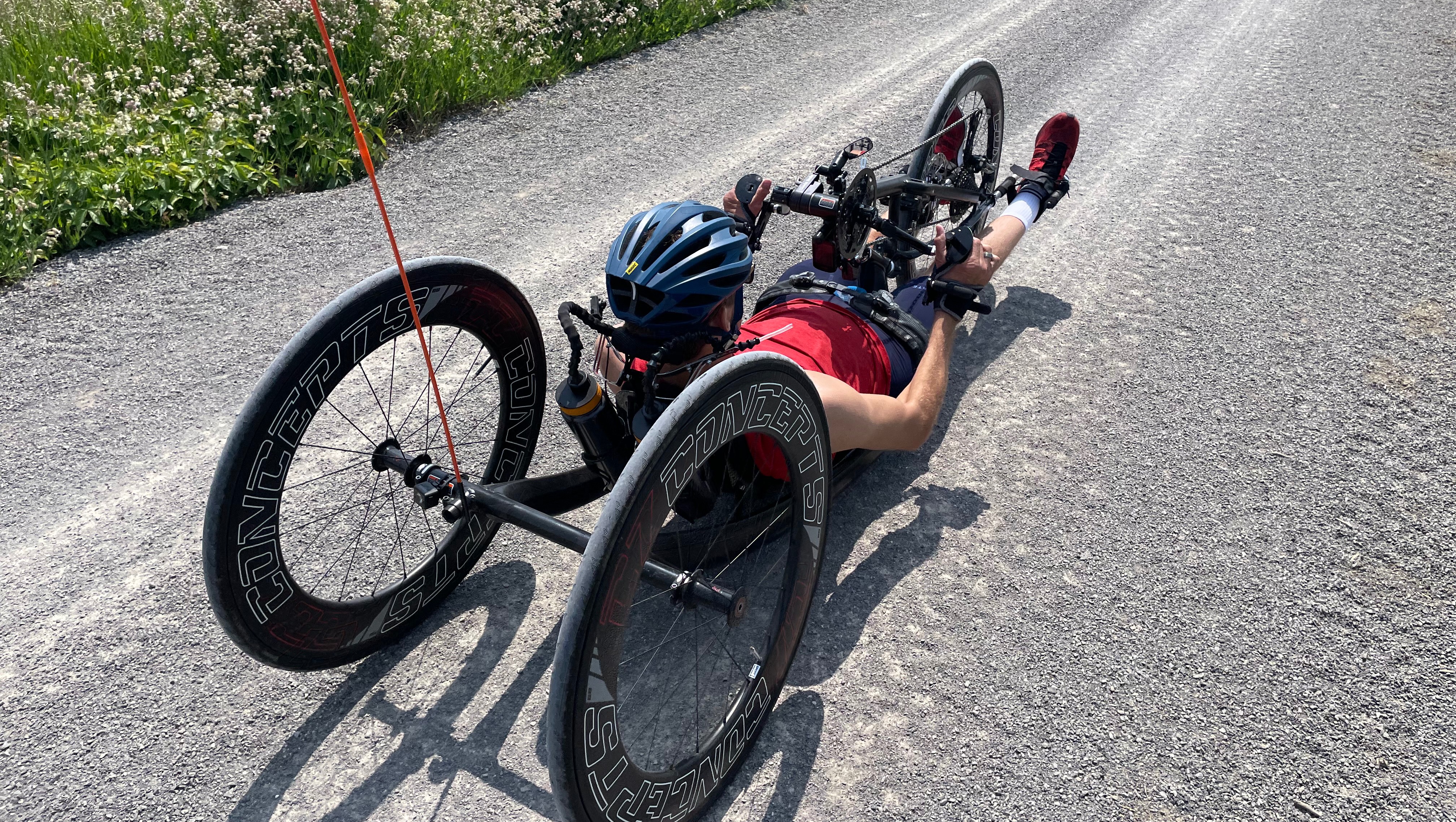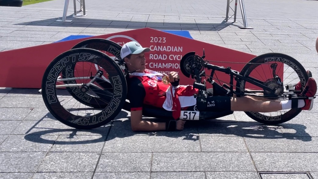 He bought his first handcycle in the Fall of 2018, and in the Spring of 2019, kicked off his first season with the CN Cycle for CHEO. Casual rides got increasingly faster and longer, upgrading to his first racing bike in 2020. During the pandemic his time was mostly occupied with being outdoors and cycling the Parkway in the National Capital Region, even bribing the kids with ice cream to complete 20 km rides. All this time on bike really allowed him to build up his strength and endurance. Lucky for him, his wife is an avid cyclist and his support rider on 50km and 70 km training rides and even for time trials in National Championships.