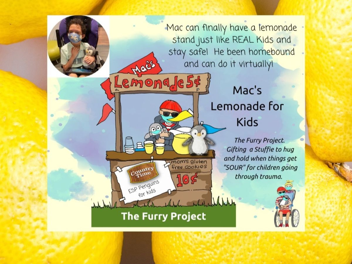 The Coronavirus would not stop Mac from having a Lemonade Stand. He can do it, just differently. Mac can. Mac has found that you can do anything with the internet and stay home and connect with friends. Mac can finally have a Lemonade stand and stay safe at home. Virtually he can pour lemonade and sell cookies, and raise nickels and dimes to buy Stuffed Furry's for kids going through scary things. In real life he cannot pour lemonade as his hands do not work, he cannot be near his friends to help. But he can sell Virtual Lemonade.