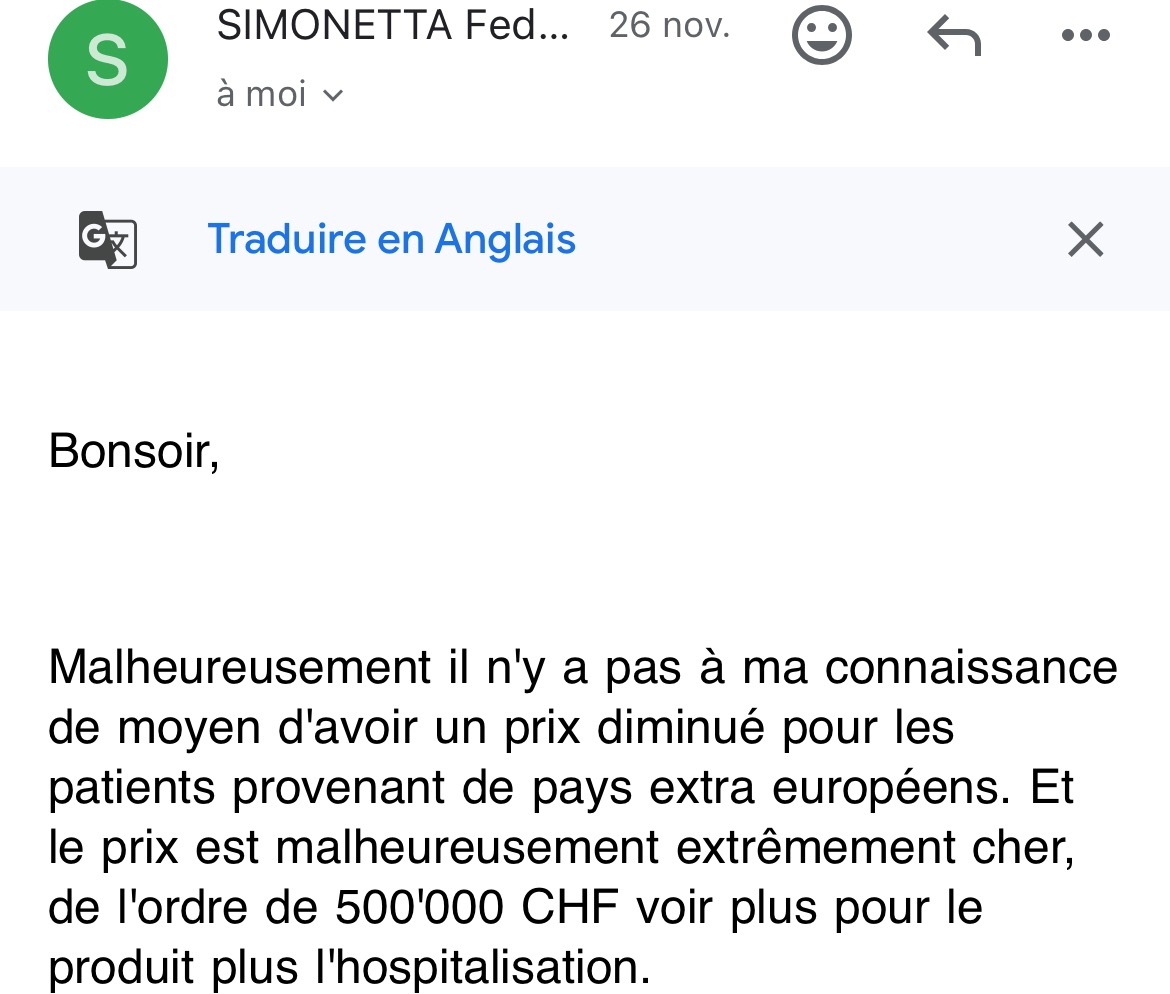 Mais ce traitement n’est pas disponible dans son pays et son coût est extrêmement élevé partout dans le monde : jusqu’à 500 000 CHF ( voir mail Dr Simonetta, HUG)