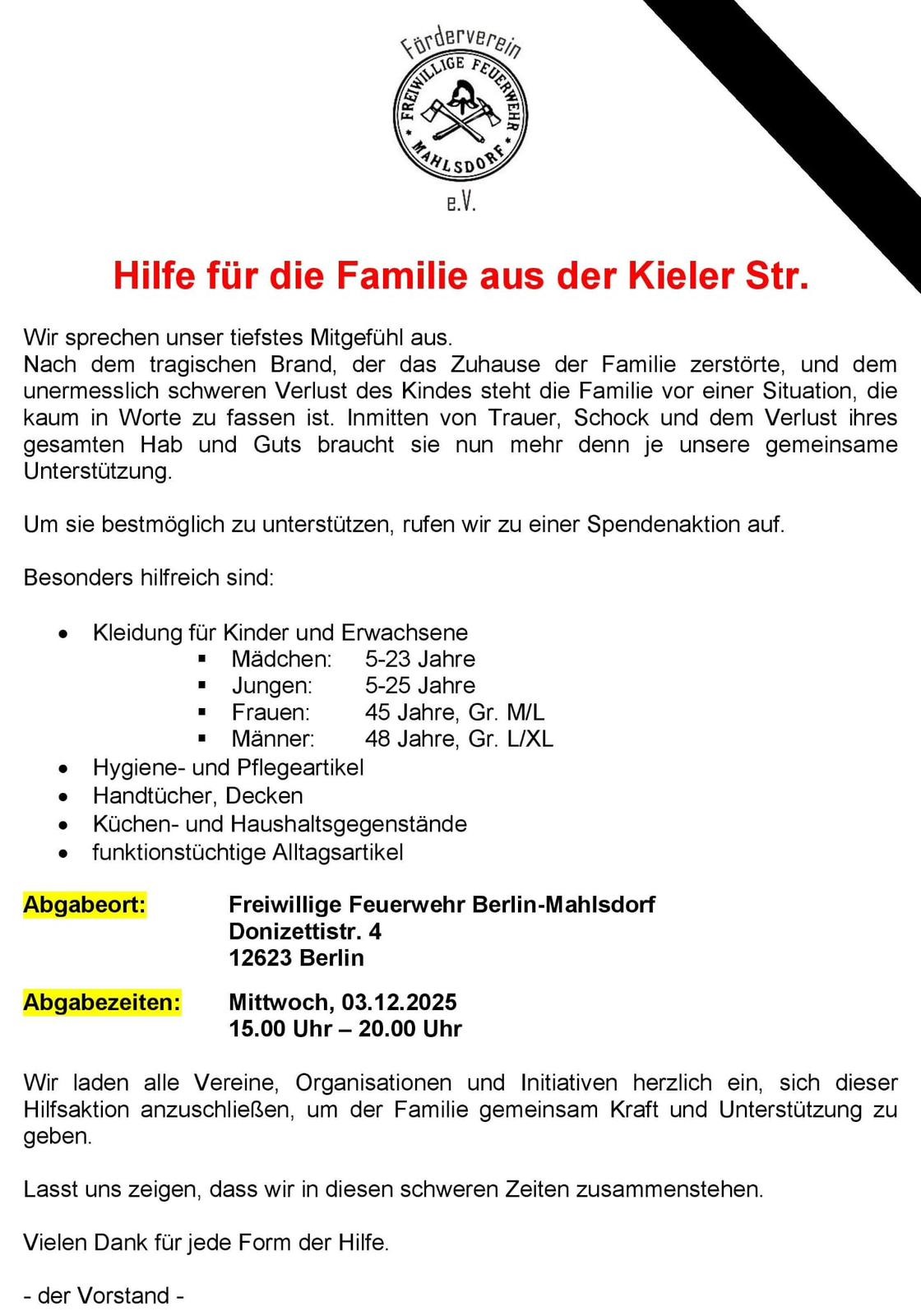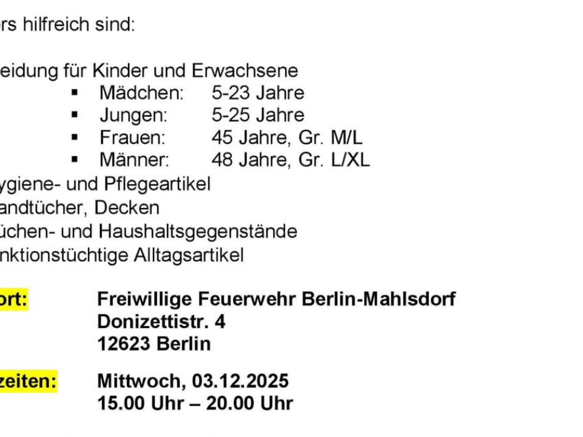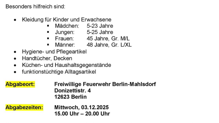 Der Förderverein der Freiwilligen Feuerwehr Berlin-Mahlsdorf plant für Mittwoch eine Sachspendenaktion auf der Feuerwache Mahlsdorf. Bild dazu gibt es in den Updates.