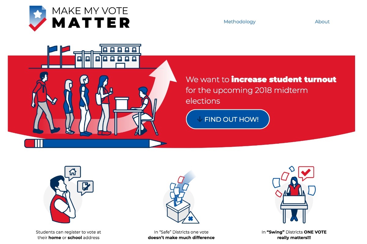 MAKEMYVOTEMATTER.COM is a website that compares the competitiveness of a college student's "Home" vs "School" voting districts, and tells them how to register where their vote will matter the most!