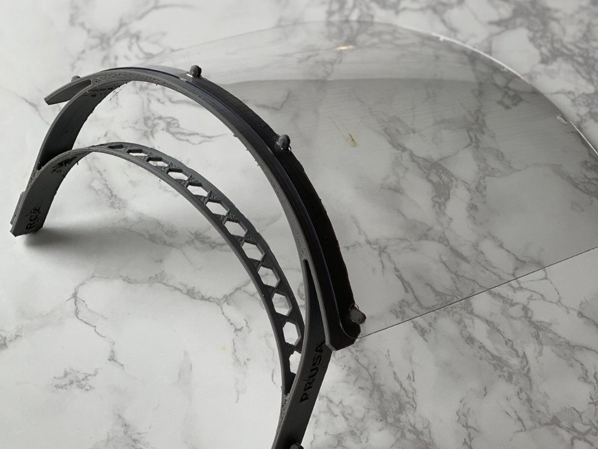 PROCESS: As you can see from the picture, the face shield is comprised of 3 main components. These designs and specs were adapted from open source files from other health organizations around the globe who have already adopted these designs and mobilized their maker communities. The shield is a .03" PETG which is the same material used in commercial shield on the market that are precision laser cut by another local maker, Humancrafted. The holder is what is being 3D printed from the same PETG filament is designed to have the disposable face shield easily attached and removed without tools. The headband (not pictured due to delay in shipping) is standard elastic band.