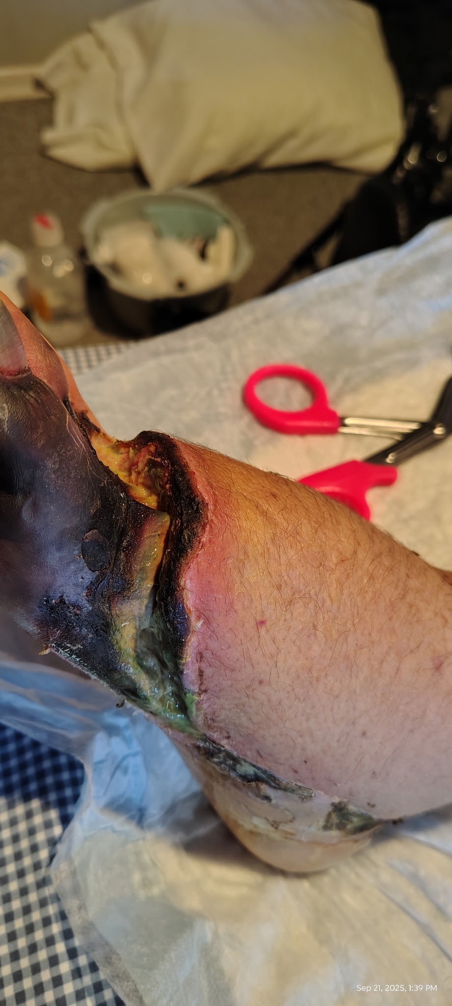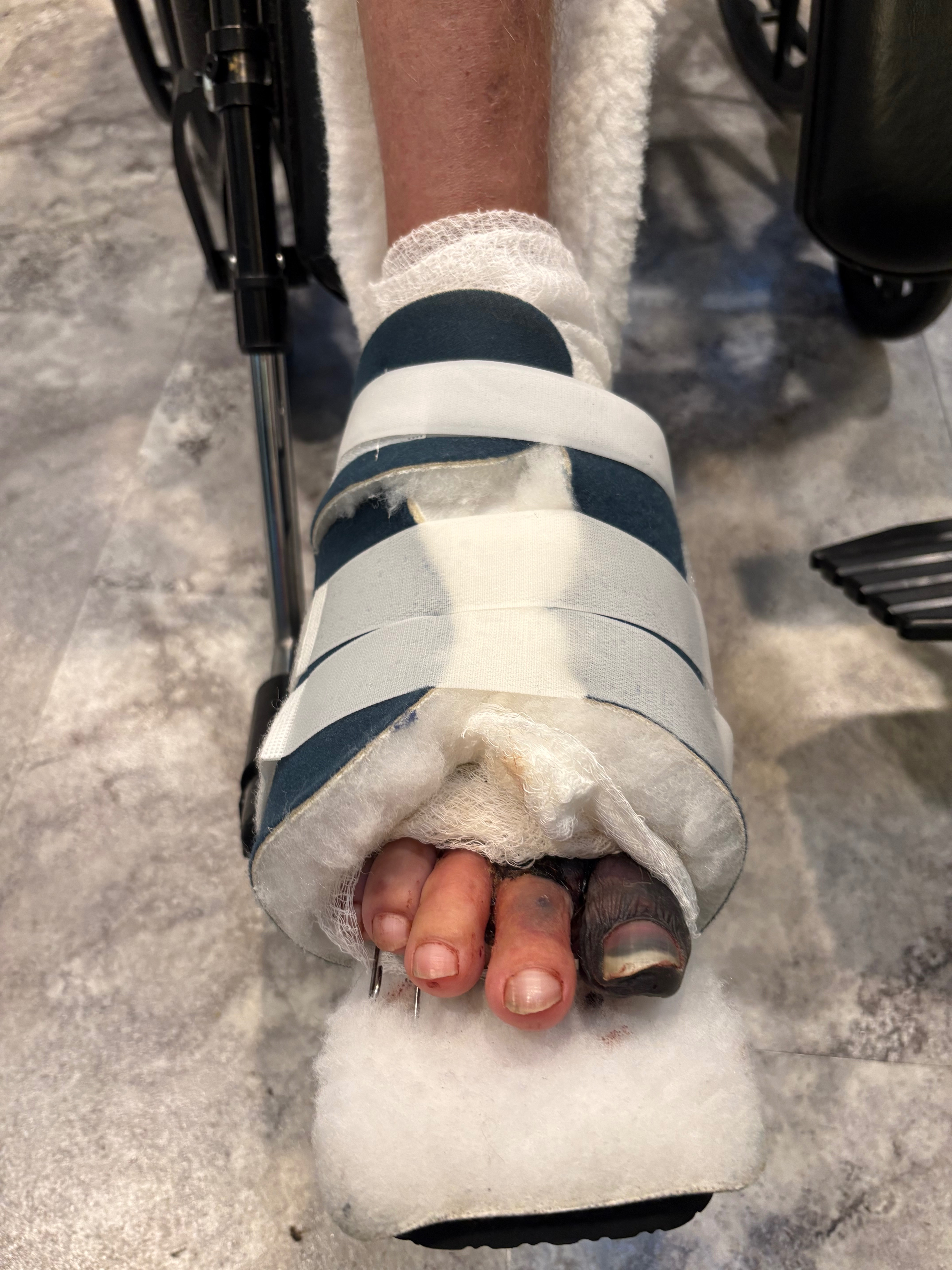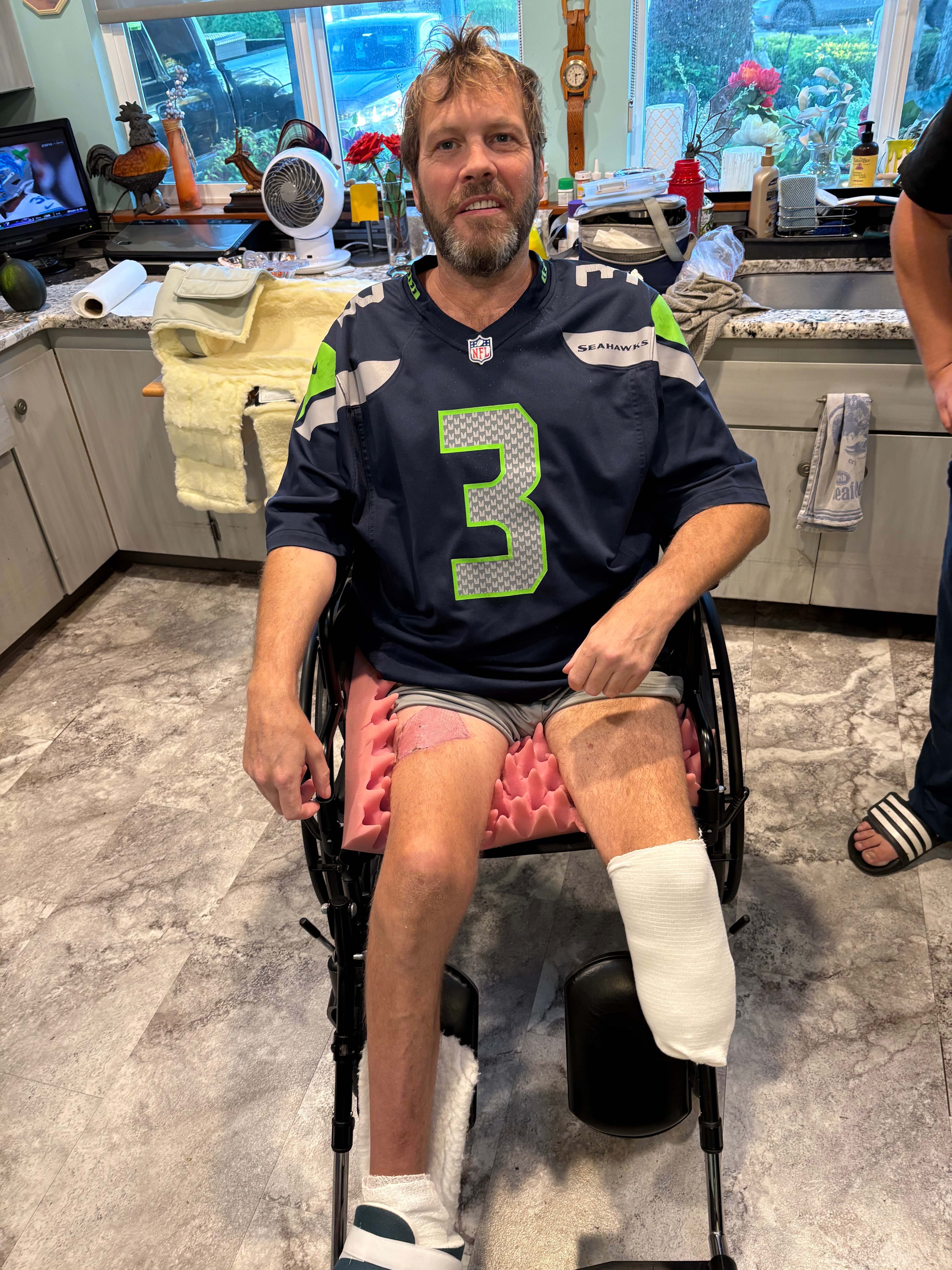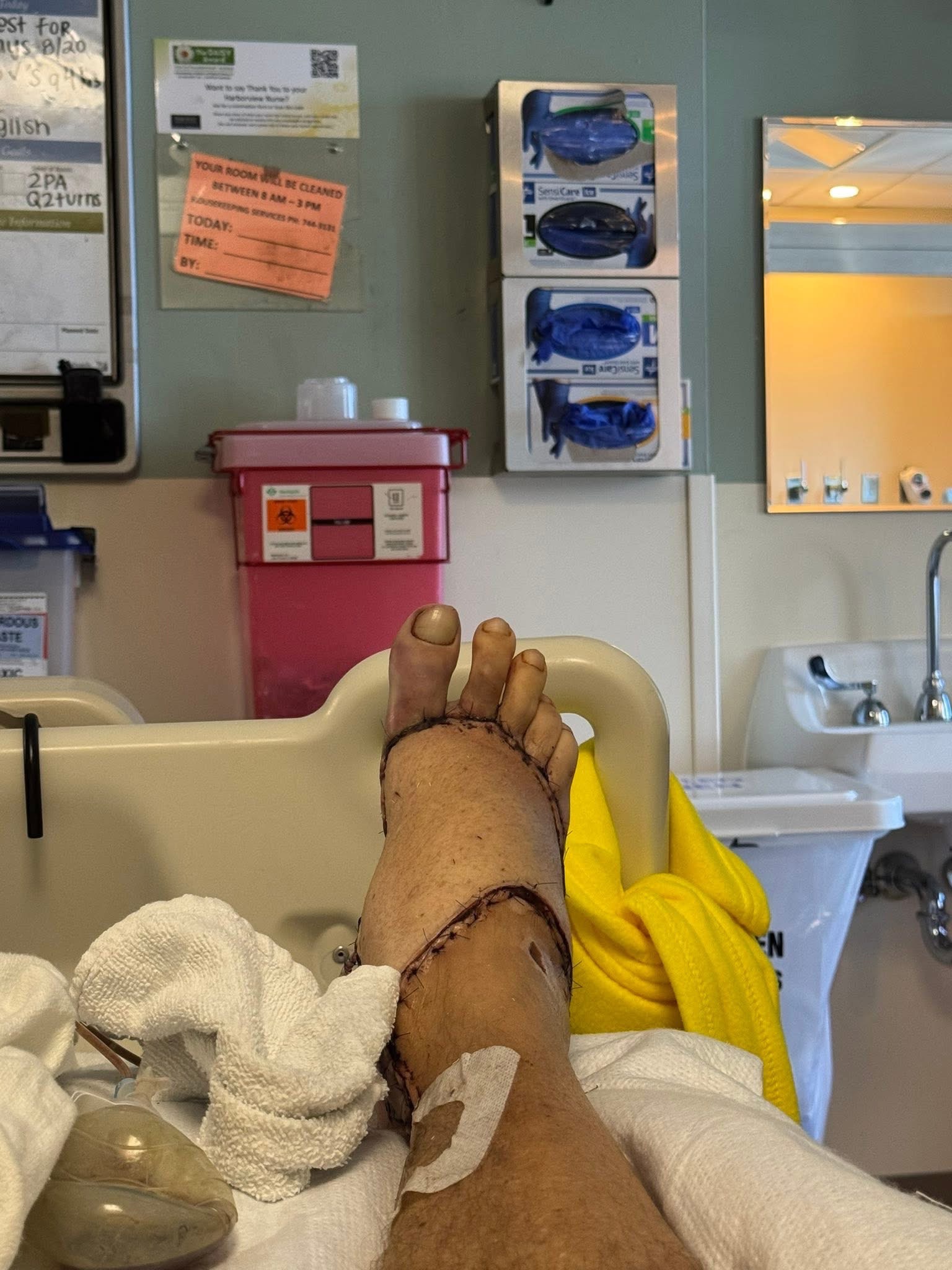 - Darin was airlifted to Harborview. After five weeks at Harborview and numerous surgeries, Darin lost his left leg beneath his knee and now he is currently back at Harborview getting his right five toes amputated as they are trying to save his right foot.