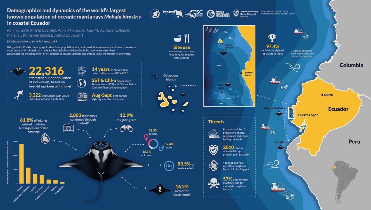 Estas preciosas especies migratorias están bajo grave amenaza de barcos pesqueros y cazadores. Los fondos recaudados irán al Proyecto Manta Rayas Ecuador dirigido por Michel Guerrero. Esta organización usará los fondos recaudados para comprar marcas satelitales que colocarán en Manta Rayas Gigantes en Isla de la Plata y Galápagos. Este rastreamento permite entender sus movimientos migratorios y así proteger y conservar a esta población que es la más grande que se ha descubierto en el mundo (más información: Michel Guerrero).
