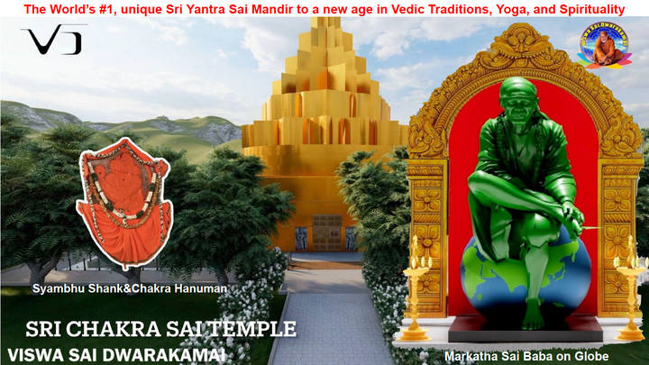 • First of its kind Markatha (Jade) Shirdi Sai Baba Murthy sitting on Universe represents Universal Sai (Viswa Sai) residing at the central point(Kendra Bindu) in Sri Yantra Sai Mandir near Hyderabad (Telangana) India.