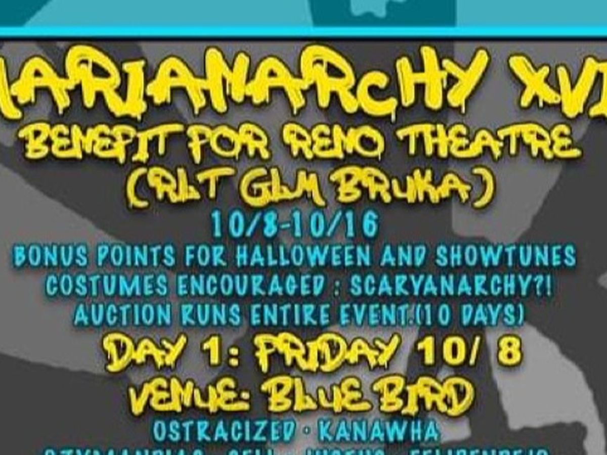 Reno NV: Marianarchy is making a comeback. Featuring over 40 local music acts and performers, the annual fundraiser swings back into action at The Bluebird on Friday and Saturday, October 8th and 9th; then again at The Cellar Stage at Alturas Bar on Friday, October 15th; and finally closing at 40-Mile Saloon on Saturday, October 16th. Normally a one-weekend event, twice per year, this two-weekend event is the only Marianarchy scheduled for 2021. The event’s proceeds will go to benefit G3, an COVID-related initiative representing three Reno community theaters: Reno Little Theater (RLT), Brüka Theater and Good Luck Macbeth Theater Company (GLM).