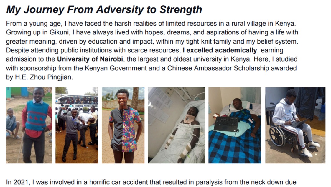 From a young age, I have faced the harsh realities of limited resources in a rural village in Kenya. Growing up in Gikuni, I have always lived with hopes, dreams, and aspirations of having a life with greater meaning, driven by education and impact, within my tight-knit family and my belief system. Despite attending public institutions with scarce resources, I excelled academically, earning admission to the University of Nairobi, the largest and oldest university in Kenya. Here, I studied with sponsorship from the Kenyan Government and a Chinese Ambassador Scholarship awarded by H.E. Zhou Pingjian.