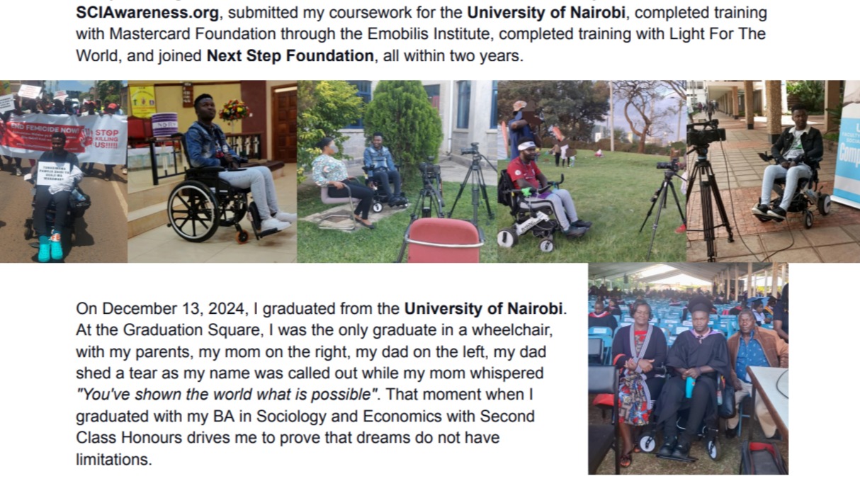 Refusing to let this injury define who I am, I began rehabilitation therapy, and quickly, I adapted to life in a wheelchair. Education became my lifeline. However, family, friends, and even some of the staff at the University of Nairobi were sceptical of my push to return, due to my injuries and continued dependence on a caregiver. I made a huge sacrifice and got a refurbished laptop, like I always do. I figured it all out. I volunteered with The Human Survival Project, founded SCIAwareness.org, submitted my coursework for the University of Nairobi, completed training with Mastercard Foundation through the Emobilis Institute, completed training with Light For The World, and joined Next Step Foundation, all within two years.
