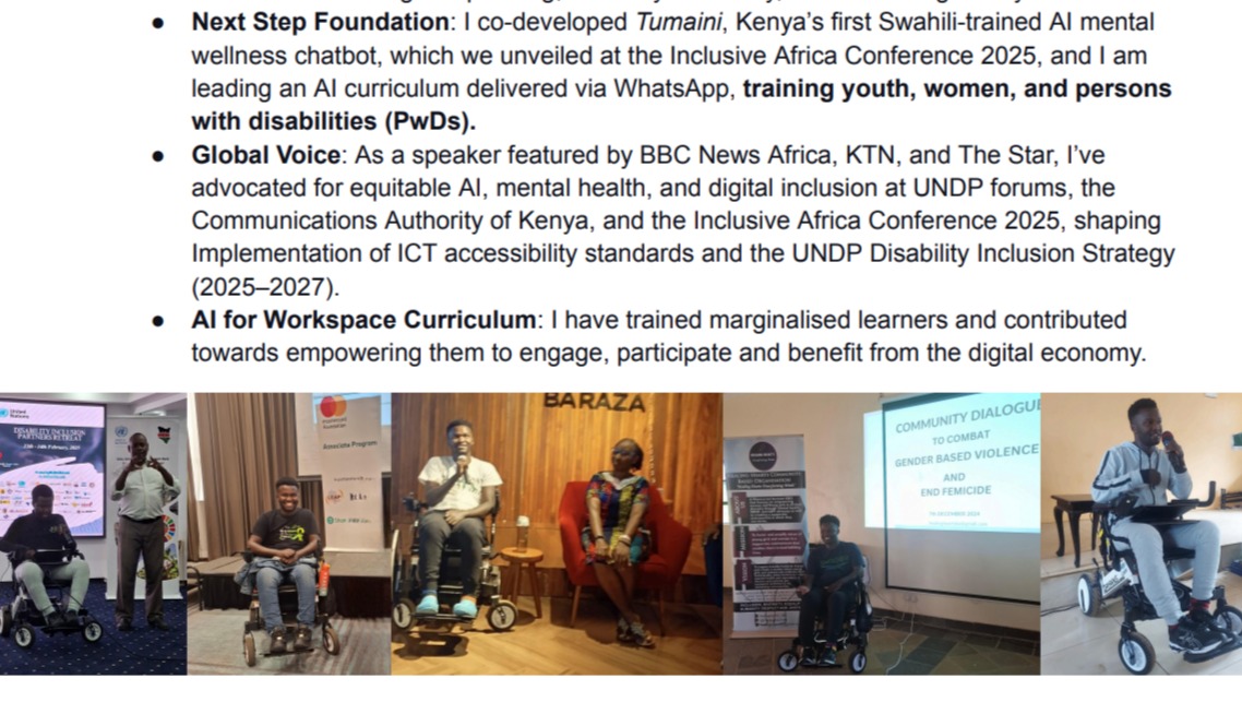 - Global Voice: As a speaker featured by BBC News Africa, KTN, and The Star, I’ve advocated for equitable AI, mental health, and digital inclusion at UNDP forums, the Communications Authority of Kenya, and the Inclusive Africa Conference 2025, shaping Implementation of ICT accessibility standards and the UNDP Disability Inclusion Strategy (2025–2027).