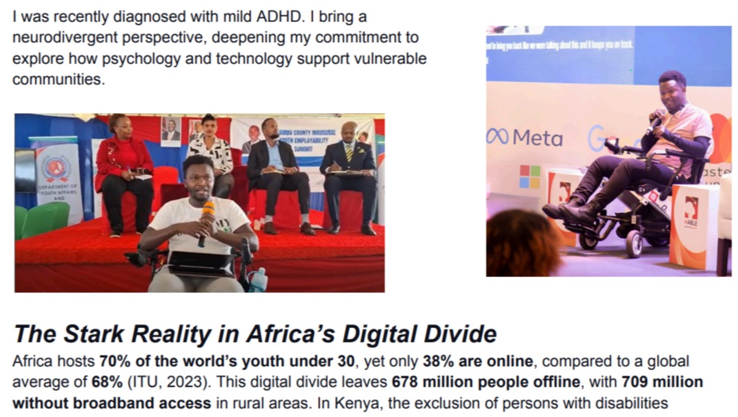 As a neurodiverse quadriplegic from rural Kenya, I experience this gap firsthand. My work addresses these barriers, but the scale demands a deeper understanding of human behaviour, hence my pursuit of psychology.