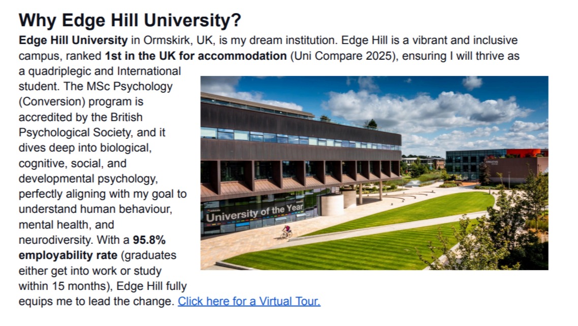 Edge Hill University in Ormskirk, UK, is my dream institution. Edge Hill is a vibrant and inclusive campus, ranked 1st in the UK for accommodation (Uni Compare 2025), ensuring I will thrive as a quadriplegic and International student. The MSc Psychology (Conversion) program is accredited by the British Psychological Society, and it dives deep into biological, cognitive, social, and developmental psychology, perfectly aligning with my goal to understand human behaviour, mental health, and neurodiversity. With a 95.8% employability rate (graduates either get into work or study within 15 months), Edge Hill fully equips me to lead the change. Click here for a Virtual Tour
