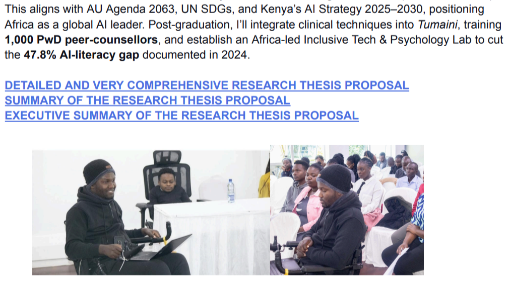 This aligns with AU Agenda 2063, UN SDGs, and Kenya’s AI Strategy 2025–2030, positioning Africa as a global AI leader. Post-graduation, I’ll integrate clinical techniques into Tumaini, training 1,000 PwD peer-counsellors, and establish an Africa-led Inclusive Tech & Psychology Lab to cut the 47.8% AI-literacy gap documented in 2024.