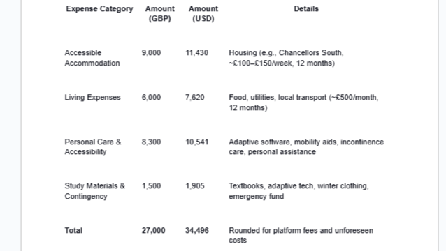 Sources: Edge Hill Accommodation, GOV.UK Student Visa, Studyportals. If additional grants are secured or costs drop, surplus funds will support other students with disabilities or enhance my advocacy initiatives in Kenya.