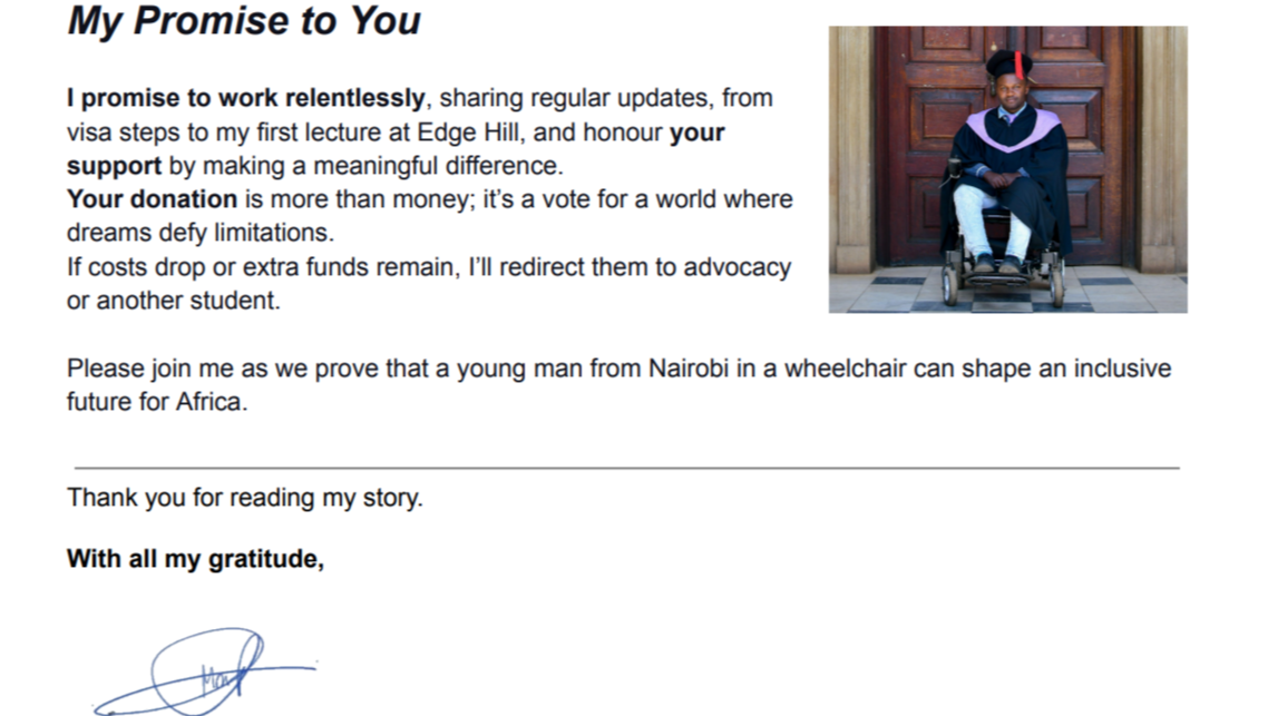 In Kenya, there is no funding for overseas studies, no loans, and no FAFSA. My parents have used everything they have. My Dad had to sell his car to cover my medical needs, and my mom left her job to care for me. They’ve tapped savings and rallied our community, but the remaining costs are beyond their reach. As a quadriplegic, I face unique expenses for accessible travel, housing, and equipment. I find it difficult to ask for help, but my disability has taught me we’re stronger together, and this is my shot at Edge Hill, and I need you.