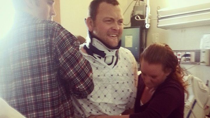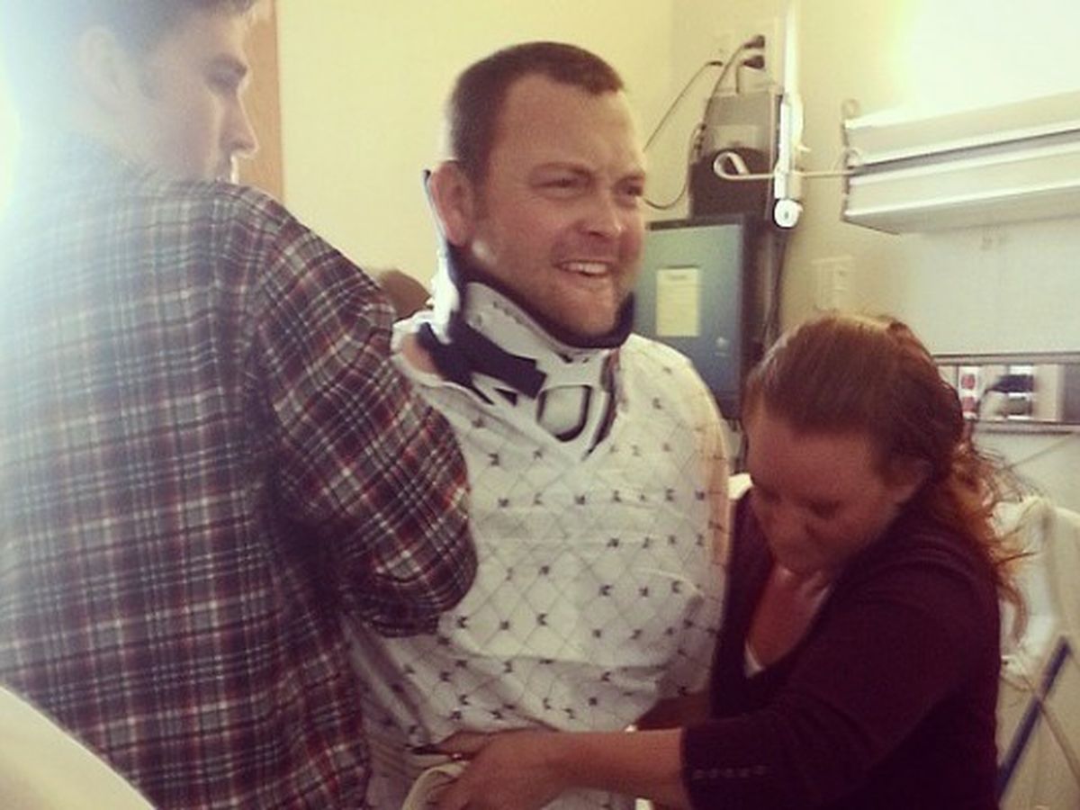 To Mark's recollection and the position of the snow machine, Mark flew off and landed on his neck/back. This landing causing complete disintegration and dislocation of C6, pinching his spinal cord between C6 & 7.  Mark had to have his neck fused as well as his spine realigned.  Thankfully his spinal cord was not severed, but it was significantly damaged. Prior to surgery Mark had no movement only feeling in his lower extremities, and we were told he was unlikely to walk again, paralyzed from the neck down.