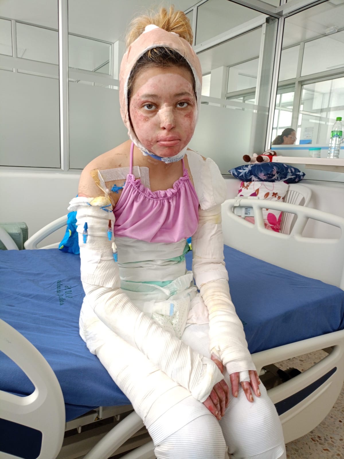 Fui quemada en el 80% de mi cuerpo. He pasado por más de 71 cirugías y aún necesito muchas cirugías reconstructivas, tanto en mi cuerpo como en mi cara, que son muy costosas. Han tenido que raparme el cabello para poder sacar piel de mi cabeza y usarla para injertarme en el abdomen y en otras partes de mi cuerpo.