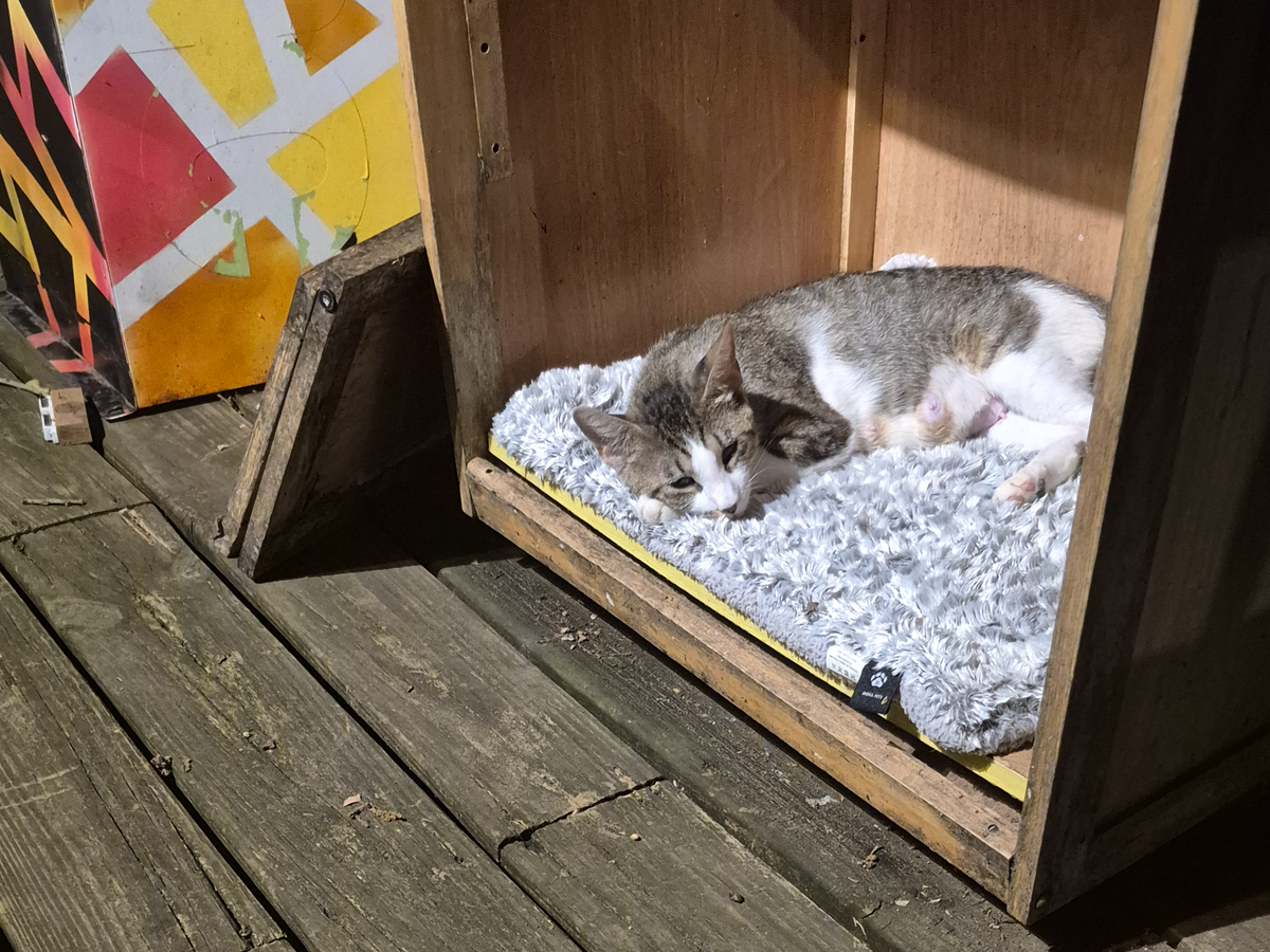 CC would come by frequently, and we noticed that her tail was broken. That's around when her human stopped responding to our messages. Then CC eventually became pregnant and took permanent residence at the abandoned house next to us. We bought an outdoor cat house because we were worried about our two elderly inside cats.