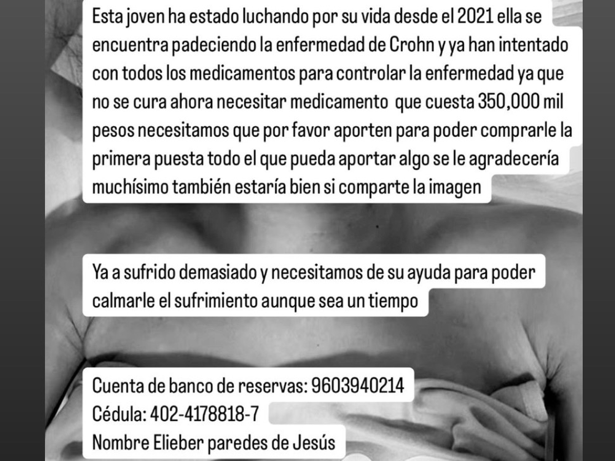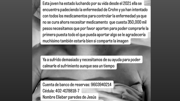 Hey everyone! My name is Elieber Paredes de Jesus. I’m from Puerto Plata, Dominican Republic. I'm 22 years old and I have a daughter, a 4-year-old named Abigail Paredes. I have Crohn’s disease, which is a chronic inflammatory bowel disease that affects the lining of the digestive tract. I’m currently at the hospital and I am in need of a medicine that can help me, but I do not have enough money to get it.
