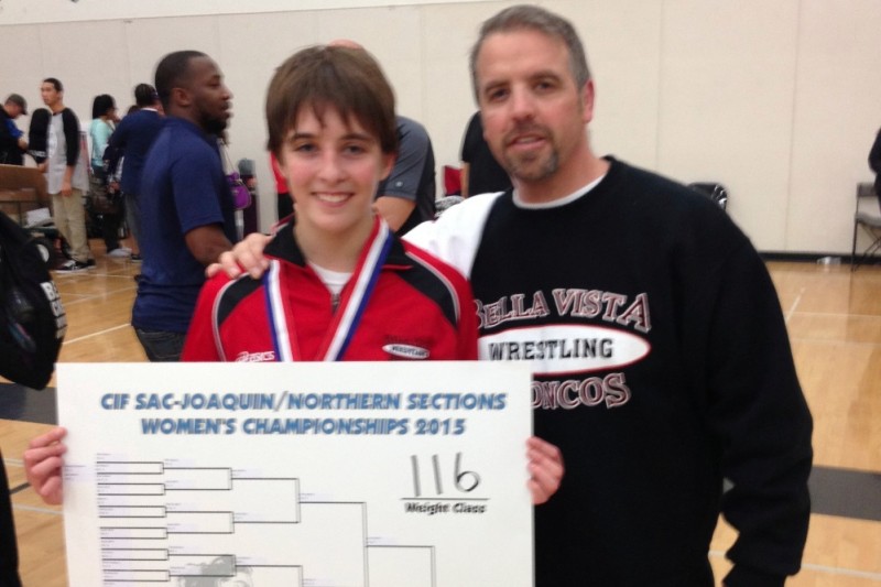 My fifteen-year old daughter Alex Hedrick is a sophomore who attends Bella Vista High School in Fair Oaks, CA. She began wrestling in 6th grade on a boys wrestling team at Carnegie Middle School, and since that time, she has been an active member on wrestling teams at the middle school and high school level. She has competed at multiple local and state level wrestling events competing sometimes in boys divisions and sometimes in girls divisions. In 8th grade she medaled in the Northern California Championships for boys and won the Middle School State Tournament for girls. Last year, as a freshman, she placed 3rd in the California Girls High School State Championship after missing most of the regular season with a dislocated shoulder. She was the only 9th grader in any weight class to medal in the Girls State Championship last season. This season she recently won the Sac-Joaquin and North Section Championships and will be wrestling in a couple of weeks at the State Championship.