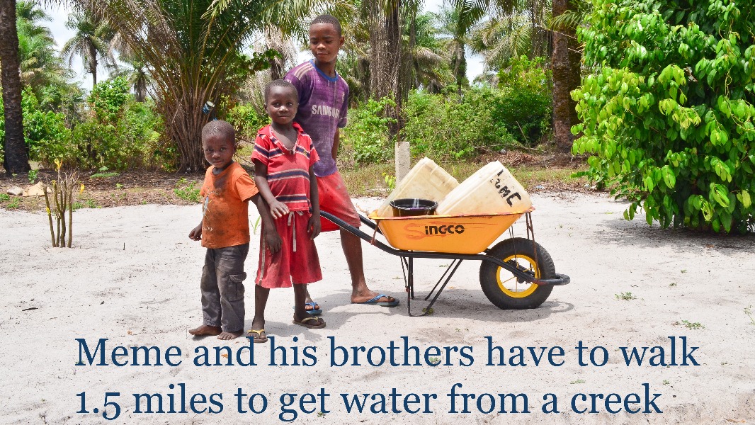 The brothers have to push a wheelbarrow a mile and a half in order to get their water from a creek. It's a hard job, and the water isn't sanitary.