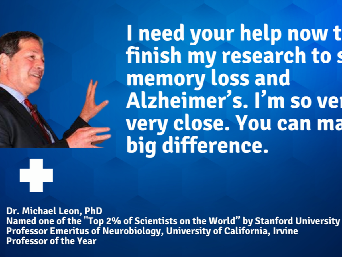 I’m Professor Michael Leon, recently named as one of the Top 2% of Scientists in the World. And I’m finally, finally close to helping stop memory loss, including from dementia and Alzheimer’s. Please help fund this important memory research to get me quickly over the finish line now.