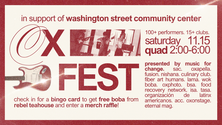 Each semester, we host Oxfest. OxFest is more than a student concert-- it is a vibrant and inclusive charity event celebrating art, music, culture, and social change. This event brings the diverse clubs and community members at Oxford to showcase their talents, promote positive societal impact through creative expression, and have a great time! We have consistently raised over $200 to local nonprofit organizations each time.