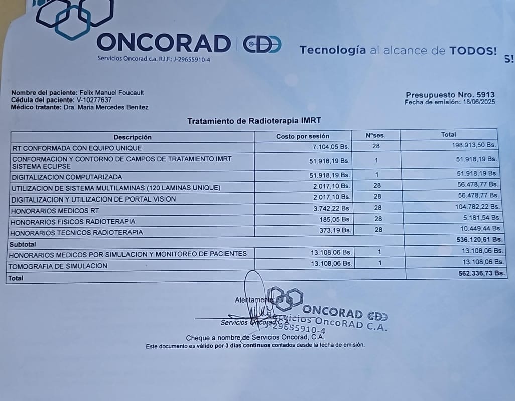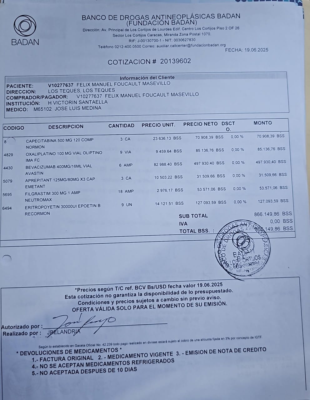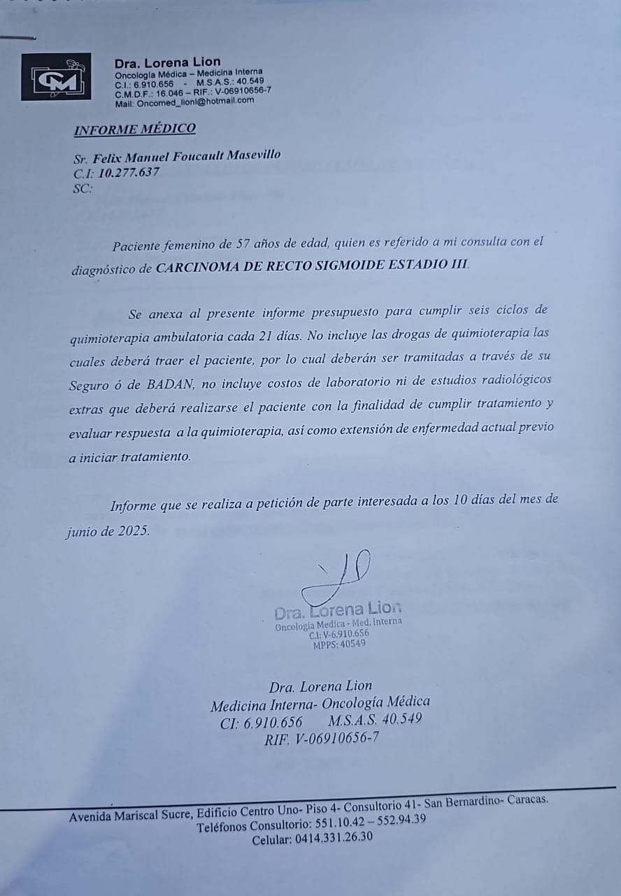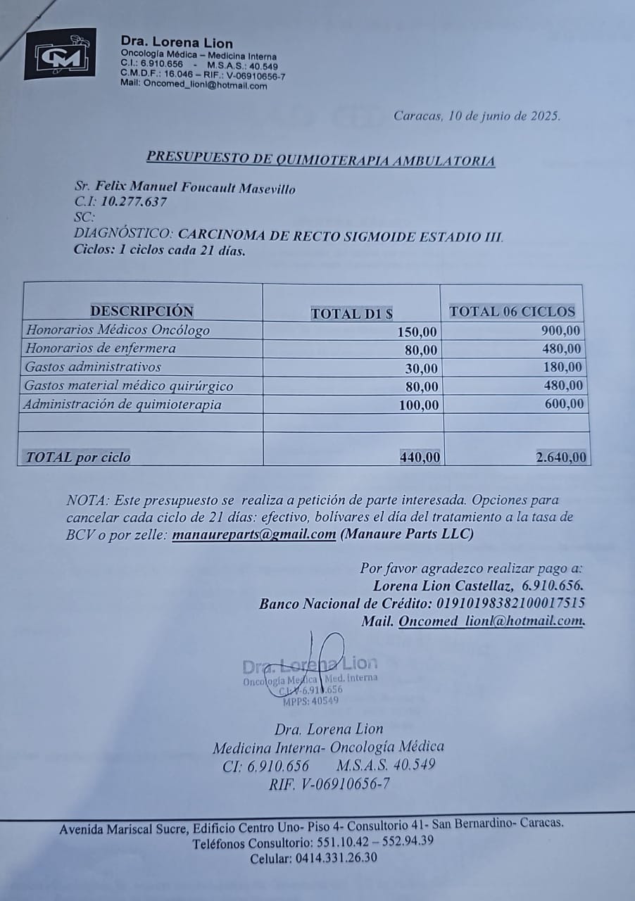 While my family supports me with colostomy bags and medication, the Venezuelan healthcare system offers limited assistance. I have received help to begin chemotherapy, but I urgently need funds for radiotherapy and additional medications, treatments that I will soon need to undergo simultaneously.