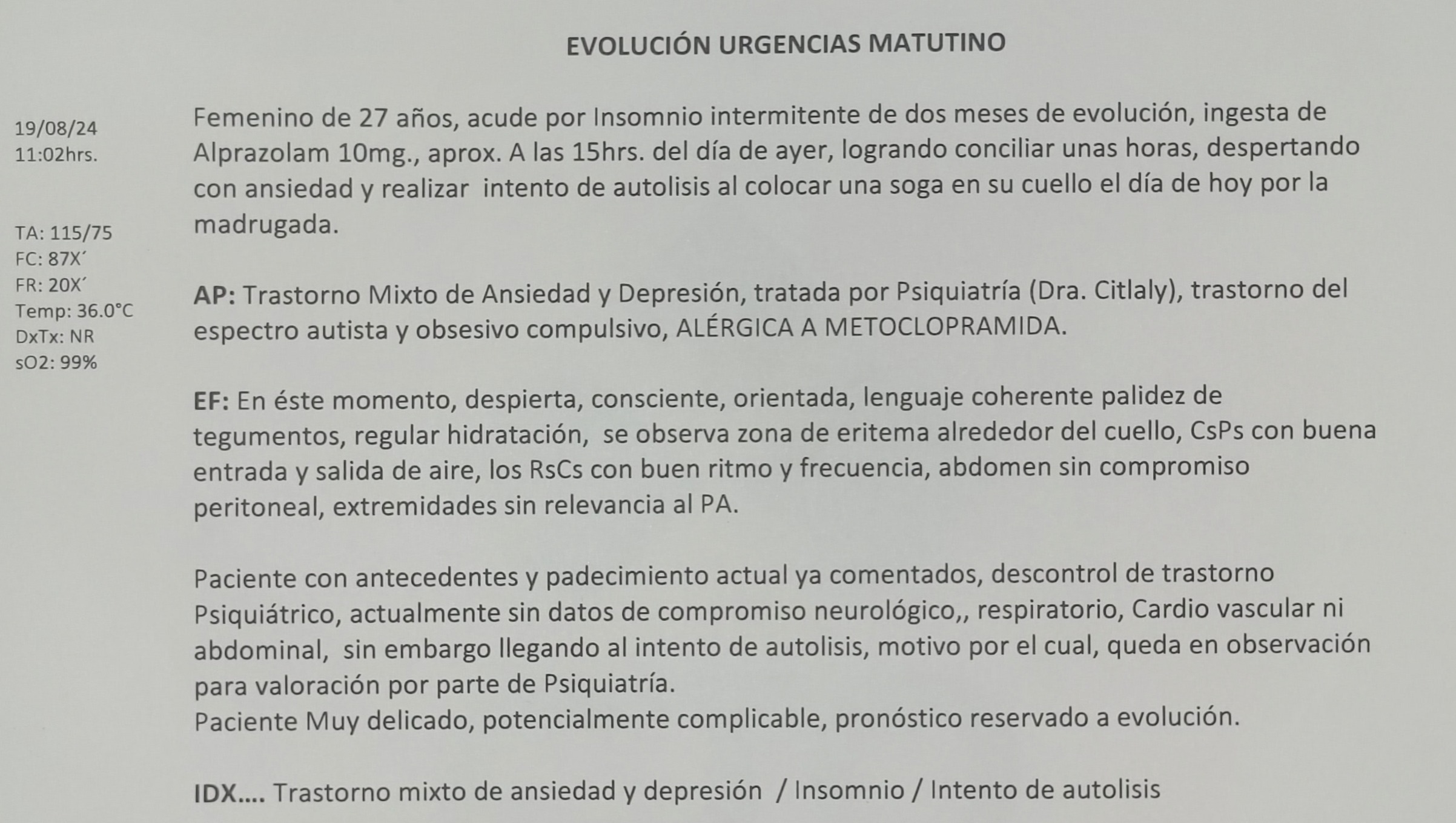 El día 18 de agosto del 2024, después de 5 semanas de insomnio, en un intento por dormir, tomé una dosis alta de cierto fármaco, una sobredosis la cual falló y, lamentablemente, el 19 de agosto por la madrugada, en medio un ataque de pánico, nuevamente atenté contra mi vida, está vez tratando de asfixiarme.