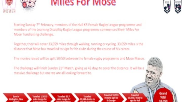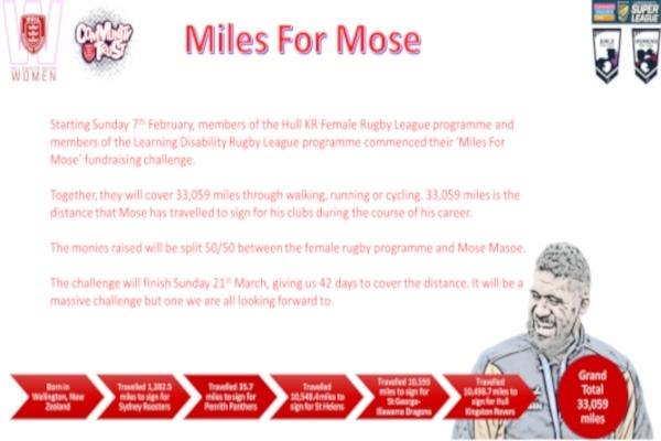 We have decided to fundraise through the Miles for Mose challenge. This consists of all participants working together to collectively accumulate 33,059 miles in a 42 day time frame. The 33,059 mile target represents the distance that Mose has travelled over the course of his career to sign for the clubs he has played for. The challenge started on Sunday 7th February and will end on Sunday 21st March prior to the 2021 Super League starting on Friday 26th March 2021.