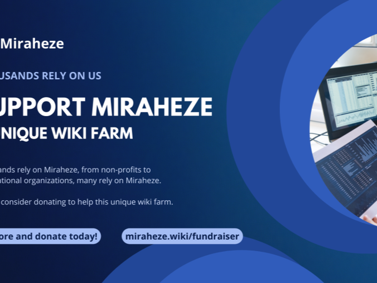 Support Miraheze, the unique wiki host. We are a not-for-profit, open-source wiki hosting service which provides free and high-quality wiki hosting and support for thousands of communities without ever displaying advertisements. With the power of volunteers, we serve our users every single day, all without pay. We also put our communities first, and we always listen to them. From its beginning, Miraheze has committed itself to always listening to its users and being community-centric. We give all stakeholders an important voice in the development of Miraheze. Unlike other wiki hosts, we care about what our users think, and we never institute significant changes without taking the community into account. Help keep this truly unique project online for years to come!