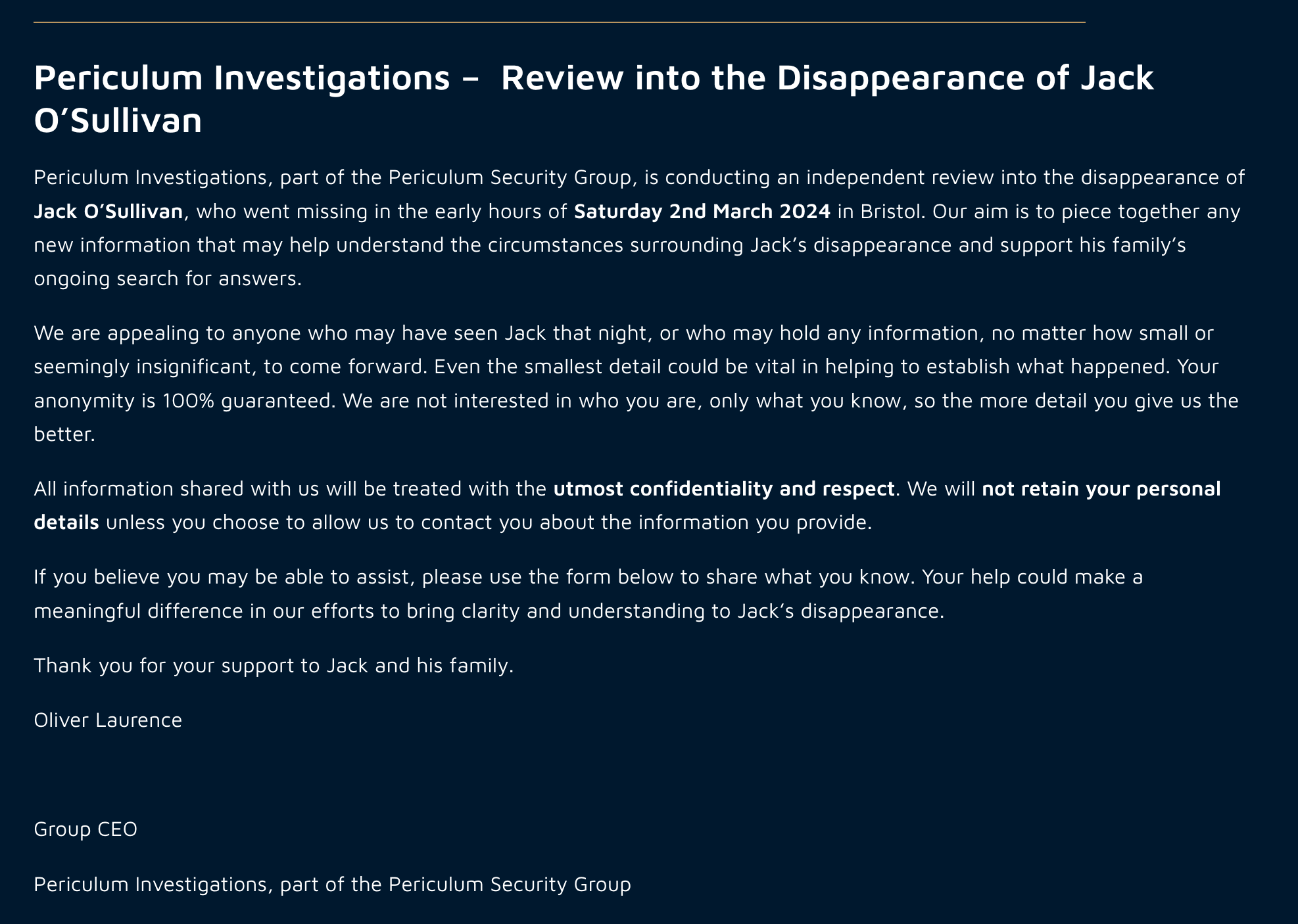 Oliver Laurence, CEO of Periculum Advisors Limited, part of the Periculum Security Group, acts as Lead Advisor to the family. All funds are administered on behalf of the family and are used solely to support investigative, search and specialist work connected to Jack’s disappearance. Any concerns, queries or questions can be directed to us directly via email.