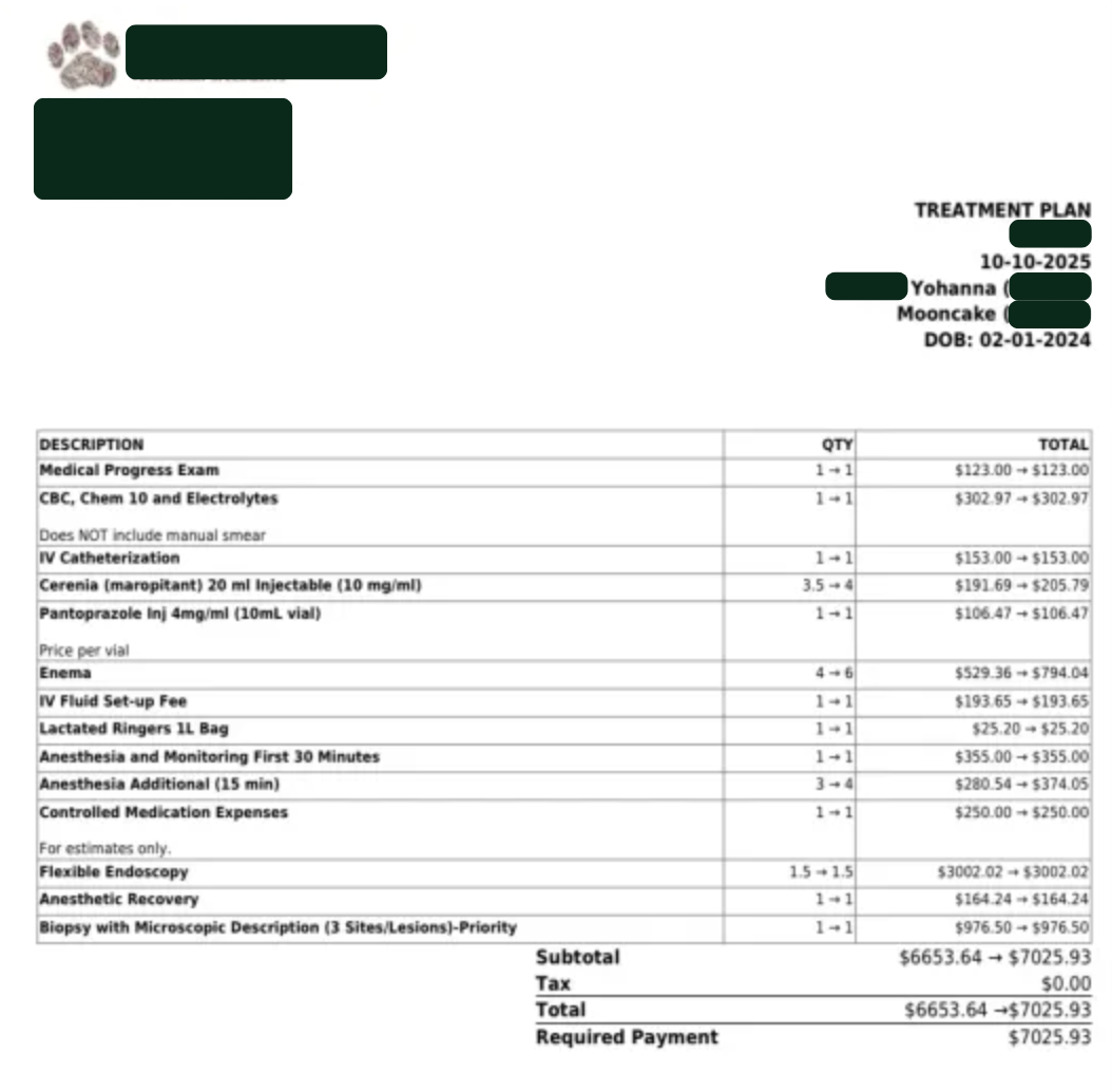 We do have pet insurance, but because Mooncake has struggled with stomach issues since she was a puppy, this is considered a pre-existing condition and isn’t covered. We’ve always tried to be prepared, but none of the specialist visits, tests, or biopsies are eligible for coverage. It’s been discouraging, but we’re determined to do everything we can to get her the care she needs and finally bring her some comfort.