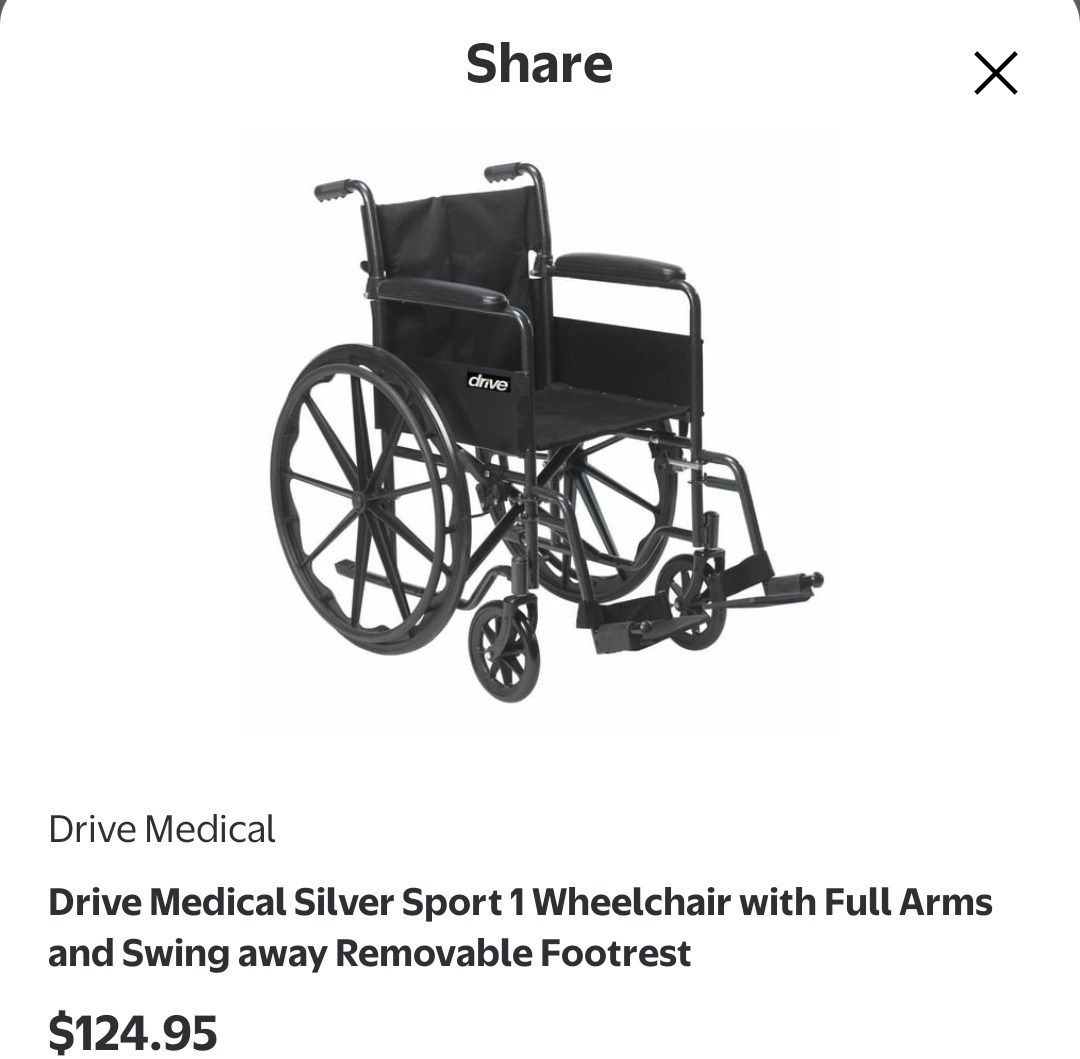 Drive Medical Silver Sport 1 Wheelchair (https://www.walmart.com/ip/15423452?sid=c4e78bf8-d07c-4d44-bd25-1fd548444afd): $124.95 (+ shipping) = $135