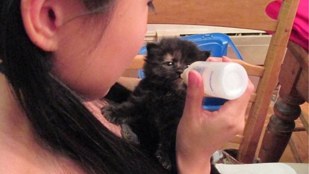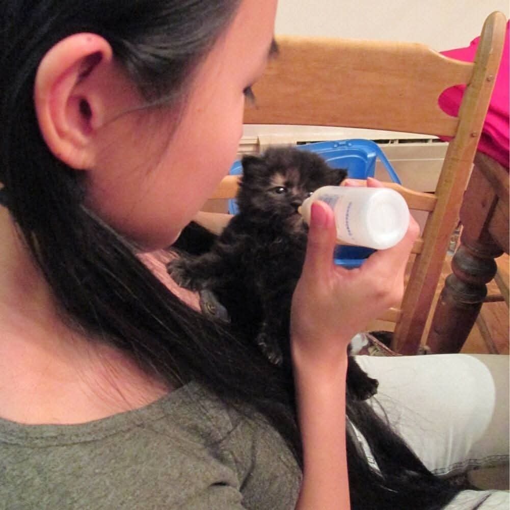 I had to get up to bottle feed her every 4hours, and use wet towel to rub her butt to help her poop, like how a mom cat raises kittens.