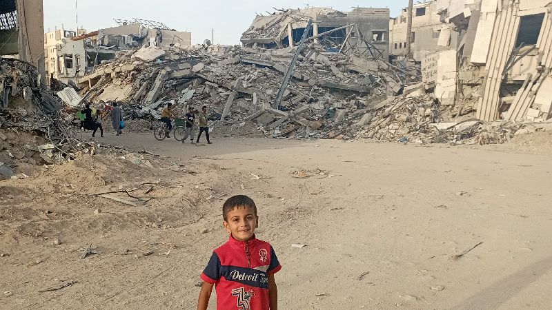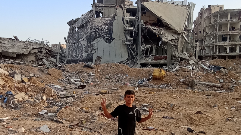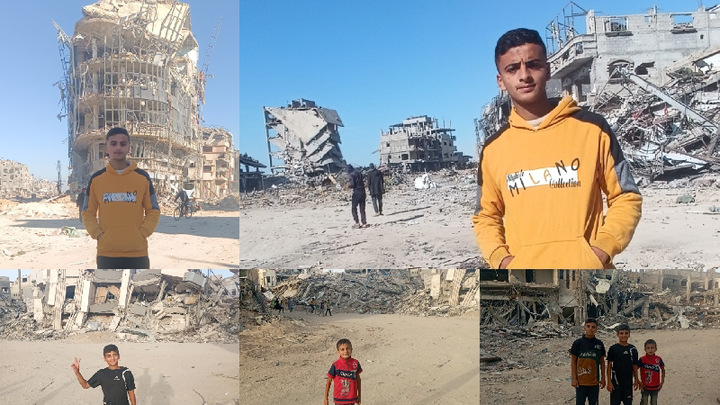 This is my little brother Mahmoud taking a picture behind the great destruction that occurred in our displacement site in Khan Yunis.