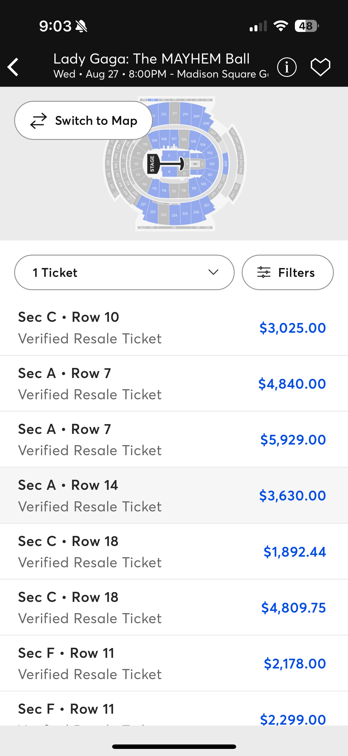 Unfortunately I missed the presale in February. I would have purchased a rad ticket at a reasonable price. I am not up on "Little Monster" (Gaga fans evidently) activities and alas missed the boat. So to the secondary market we go!!