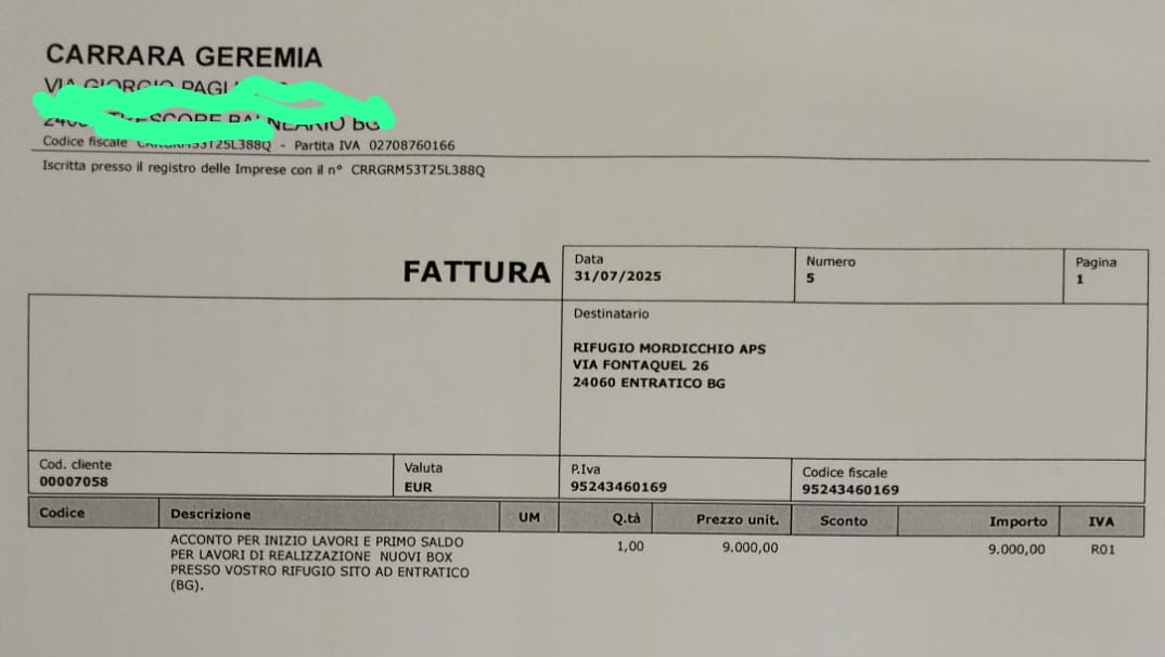 Vogliamo prima di tutto ringraziare ancora tutti per l’aiuto, le donazioni e il supporto di questi mesi. Come promesso cominciamo a pubblicare qui le spese già sostenute e le relative fatture, così che possiate vedere in modo trasparente come vengono utilizzati i fondi. Una parte delle spese è stata coperta con i soldi della raccolta fondi, una parte con la vendita delle castagne, una parte con contributi personali e una parte con le donazioni che ci avete fatto negli anni. Come potete vedere siamo ancora un po’ indietro con la raccolta: se voleste continuare a sostenerci ogni contributo, anche 5 euro a testa, fa davvero la differenza. L’obiettivo del rifugio si sta avvicinando sempre di più e grazie a voi ogni passo diventa possibile. Grazie di cuore ♥