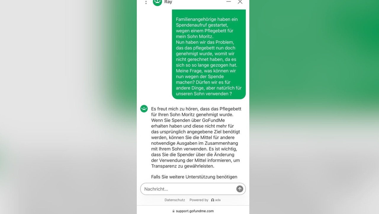 Anscheinend ist die Spendenaktion bis zur Krankenkasse bzw. Pflegekasse durchgedrungen, das Pflegebett wurde heute genehmigt, nun endlich, nach langer Zeit des Widerspruchs!! Nach Rücksprache mit GoFundMe, können die Spendeneinnahmen auch für andere medizinische Dinge für unseren Moritz verwendet werden. (Ein Screenshot der Nachricht von GoFundMe ist hochgeladen).