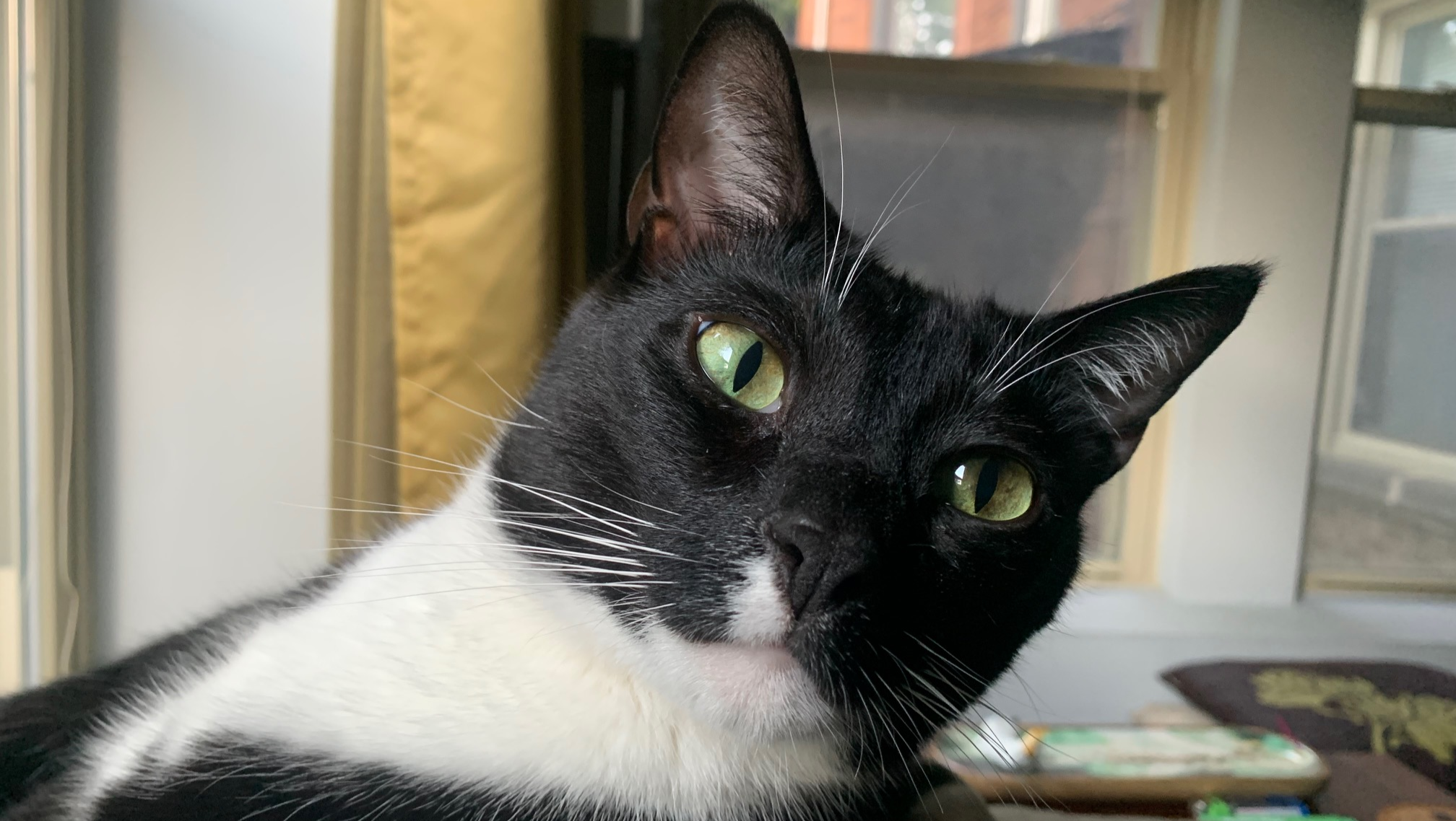 On June 24, 2019, I adopted Mork and Vinnie together and brought them home for the first time. I decided not to change Mork's unusual name because it felt like a good fit for him. At first, Mork was extremely quiet and made no sounds at all, not even for food or play or when getting an injury. It took some years, but he eventually found his voice and grew very confident about using it. It's the thing I'm most proud of him for.