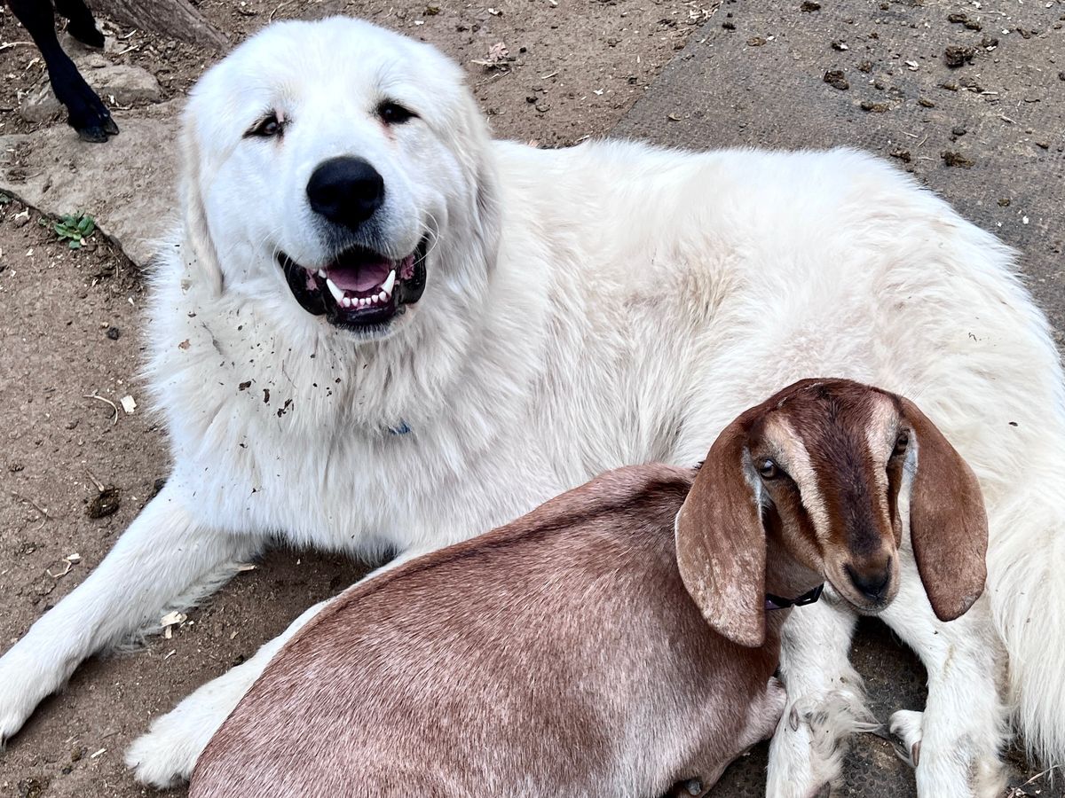 Morphie has far exceeded my dreams of what a family farm dog would be. He guards us with love and our livestock as well. He snuggled with the baby goat and protects the chickens, ducks turkey and Guinea fowl from the pesky fox. He sleeps and lives with our livestock, bonding strongly with Flora, our mini nubian doeling. He works because we love him and he loves us. He is one in a million!