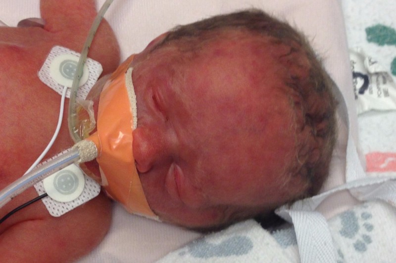 The night of the 30th, the NST test showed decelerations in MJ's heartbeat as well as some distressful lags in variability and accelerations. This prompted the Dr.'s to decide to deliver MJ on Sunday morning via C section at 32 weeks 4 days. We were to see our little boy that day!! Scary, yet exciting. MJ was brought into this world on a snowy Sunday, May 1st at 10:47am @ 2lbs 5oz and 15in long. Upon examination, it was found that MJ has what is called a tracheoespophageal fistula. (An abnormally formed esophagus) Basically, the esophagus had formed incorrectly upon it's separation from the trachea and part is not connected to the stomach. On the day of his birth he was immediately transferred to Children's Hospital to get the care that he needed. They would need to do multiple surgeries in stages. On day 1 of birth, his first surgery was to insert a "G" (Gastro) tube into his belly to expel air that had accumulated there as well as feed him when he is ready. On day 3 of birth, they then performed a fistula ligation to clip off the connection between the esophagus and trachea. This would prevent air from flowing through the trachea into the esophagus and ultimately into his stomach. MJ sailed through both surgeries like a champ. All while breathing with assistance from a breathing tube (respirator). Early concerns around his blood's ability to clot were a non issue and they were able to do the surgeries. The Dr.'s and surgical team performed miraculously and were extremely helpful in putting our worries at ease. It was also determined that MJ had jaundice and was placed under a special light with little tiny sunglasses to protect his eyes.
