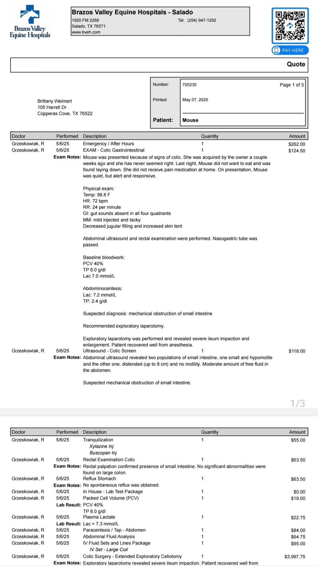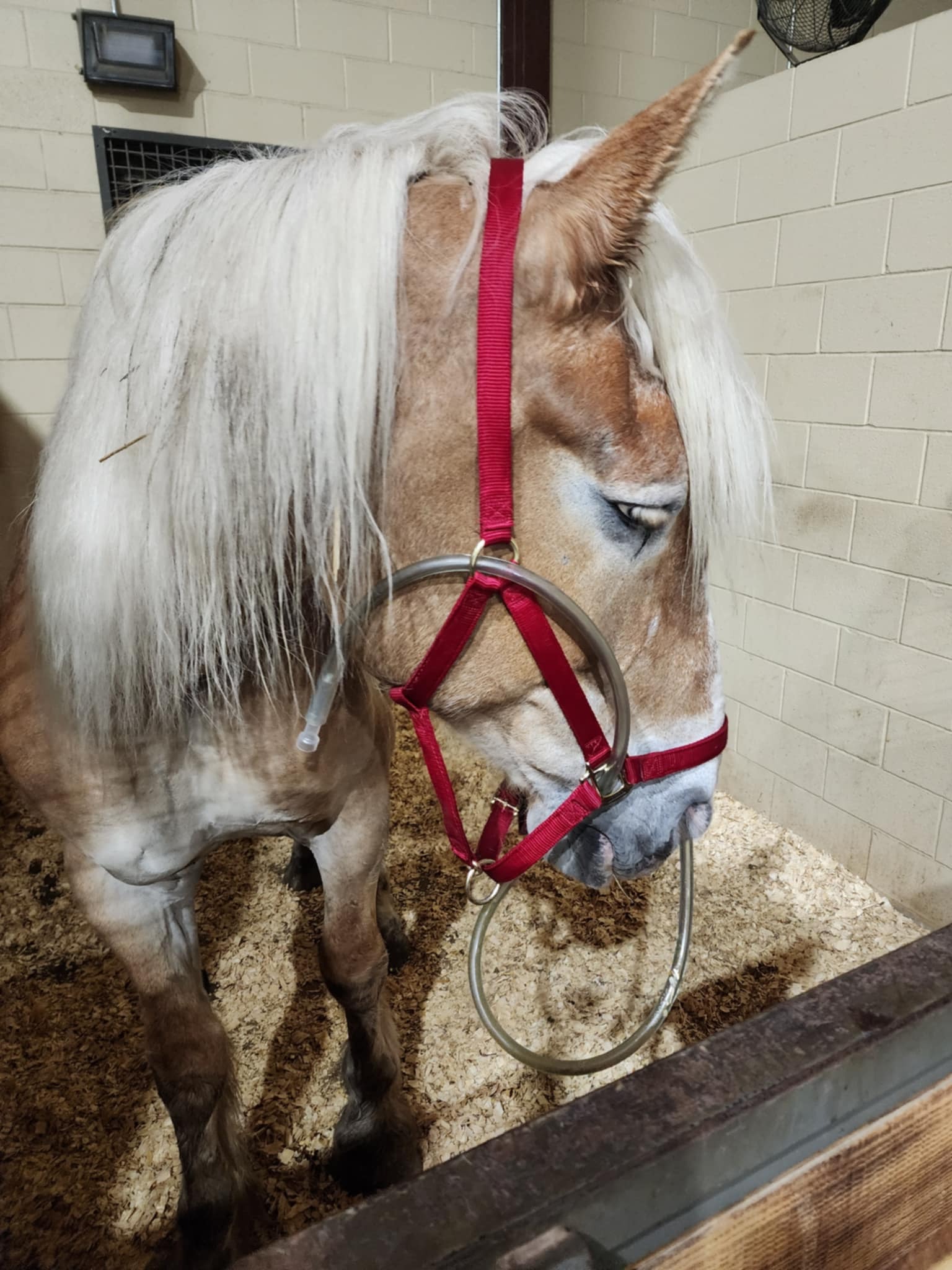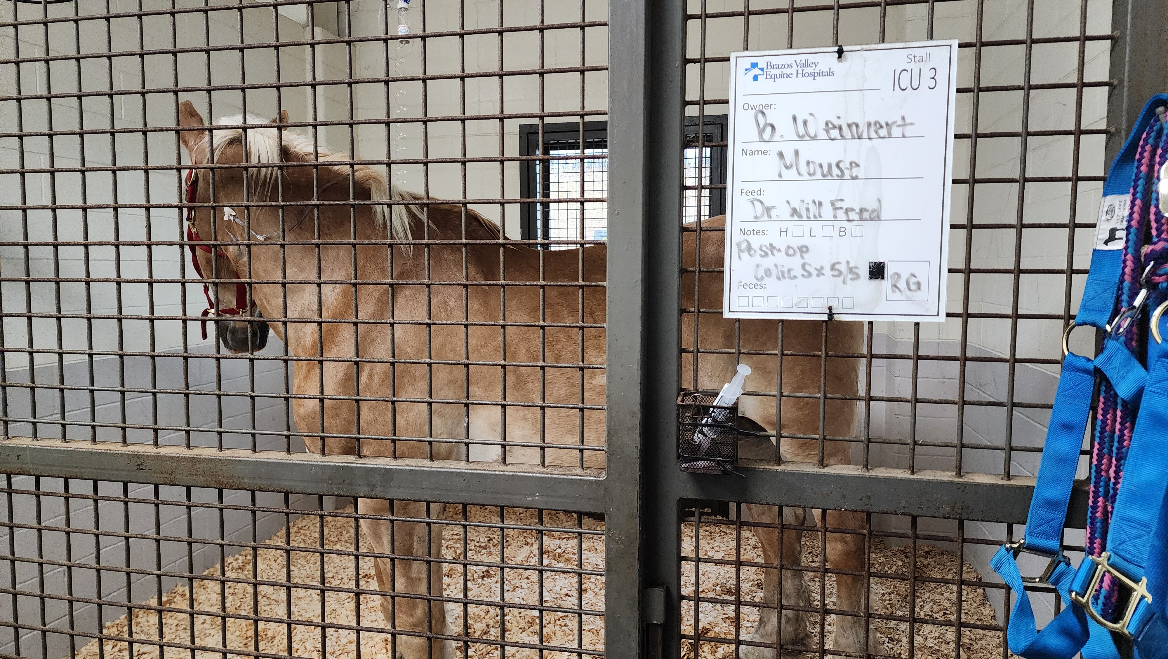 Mouse is out of surgery and now in ICU. She had an ileum impaction caused by being fed corn at the feed lot.