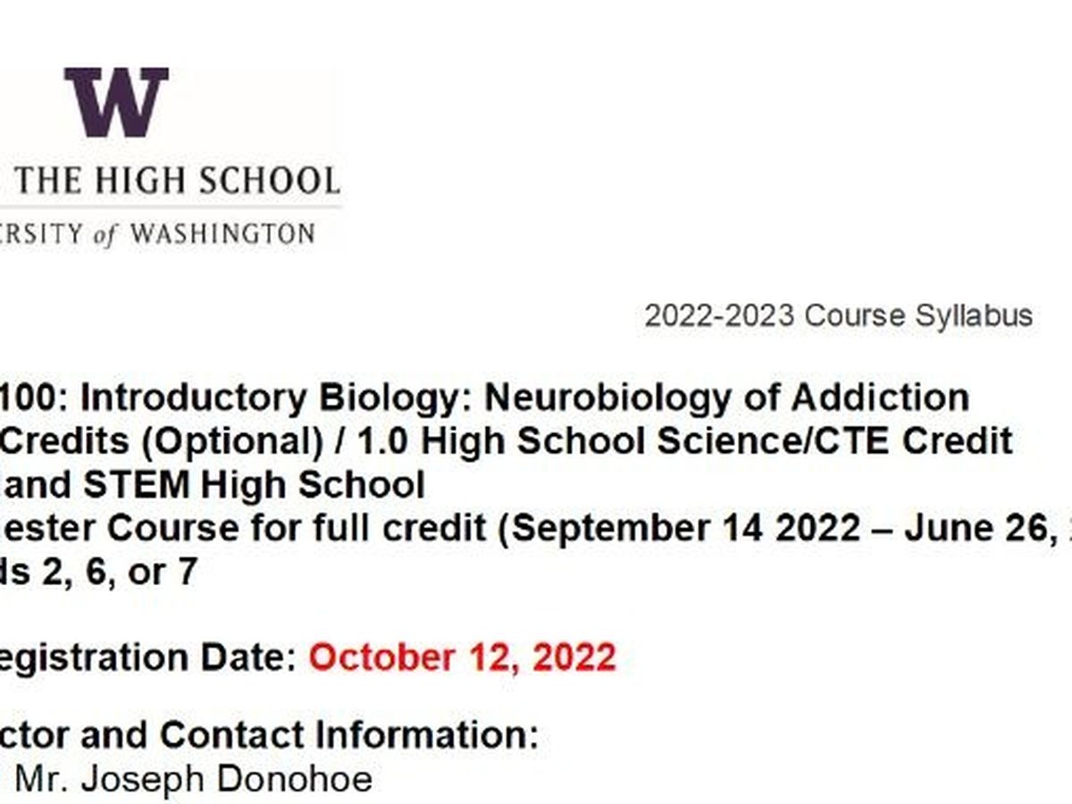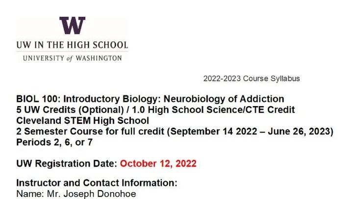 I'm Mr. Donohoe. I teach a University of Washington "Dual Enrollment" course called UW BIOL 100: Introductory Biology: Neurobiology of Addiction. This is a class offered to students of Cleveland High School in Seattle, and if they pay $375 to UW, they can also get 5 college credits for taking the course (similar to an AP class).