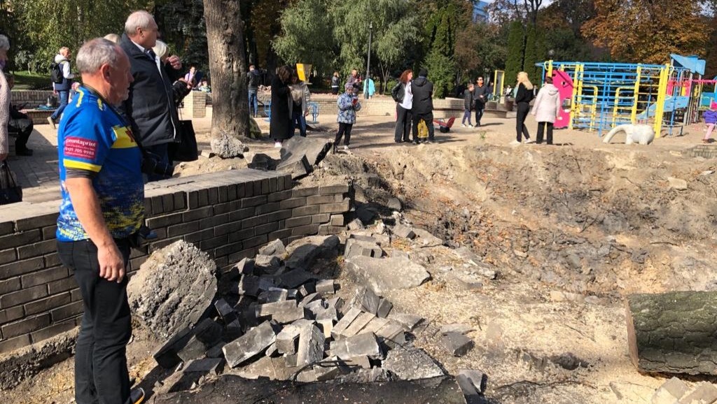 The randomness of the continued attacks was horrific and, inexcusable. Pictured below - a misguided missile that landed beside the children's play area in Taras Shevchenko Park, central Kyiv: