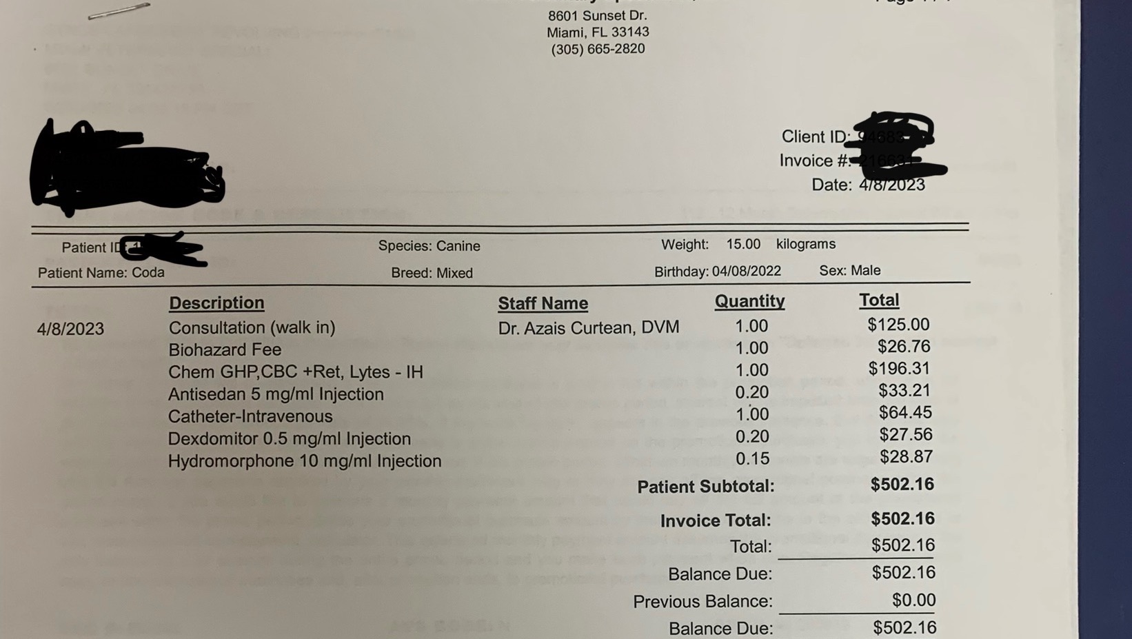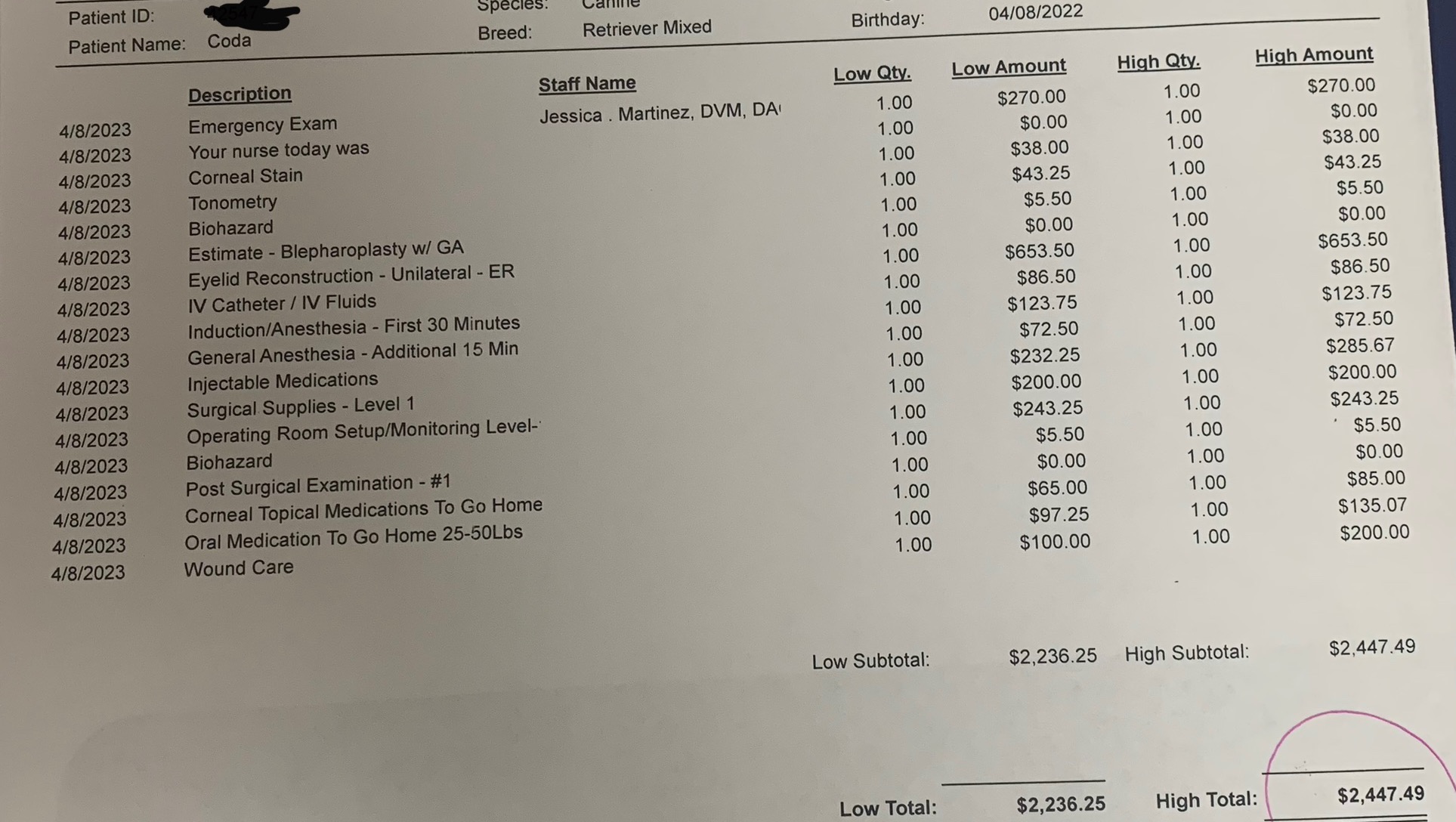 $3192.85 is what we have already spent, not including other medicines that were bought separately, and vet visits he needs in the future.