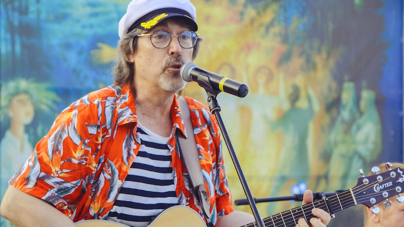 On stage at a Russian folk festival with my Crafter thinline acoustic-electric guitar