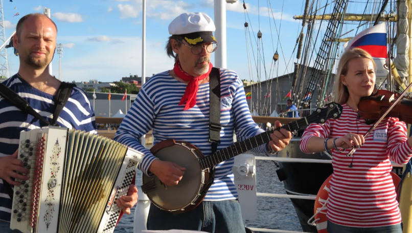 Performing aboard the Russian tall ship Mir with my Nechville Atlas banjo