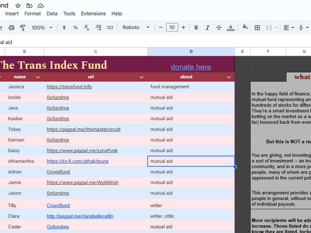 Recently, I saw a person on social media refer to their mutual aid as a "mutual fund," which is an entirely different concept, but it gave me a strange idea: what if there were a mutual aid fund for trans people in general? Something like an index fund, except instead of buying stocks for 500 businesses, you're giving to the livelihood of hundreds of different trans people.